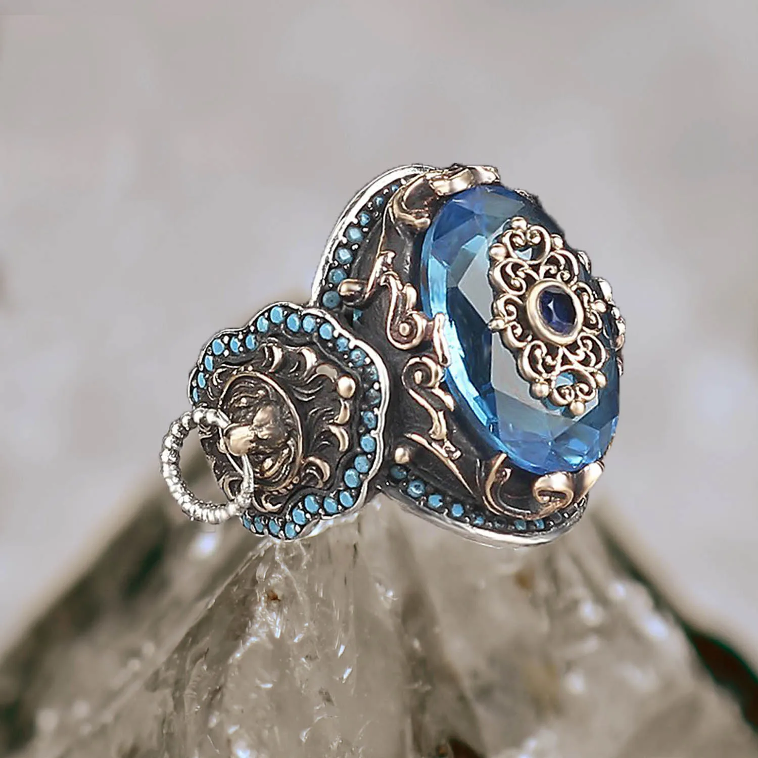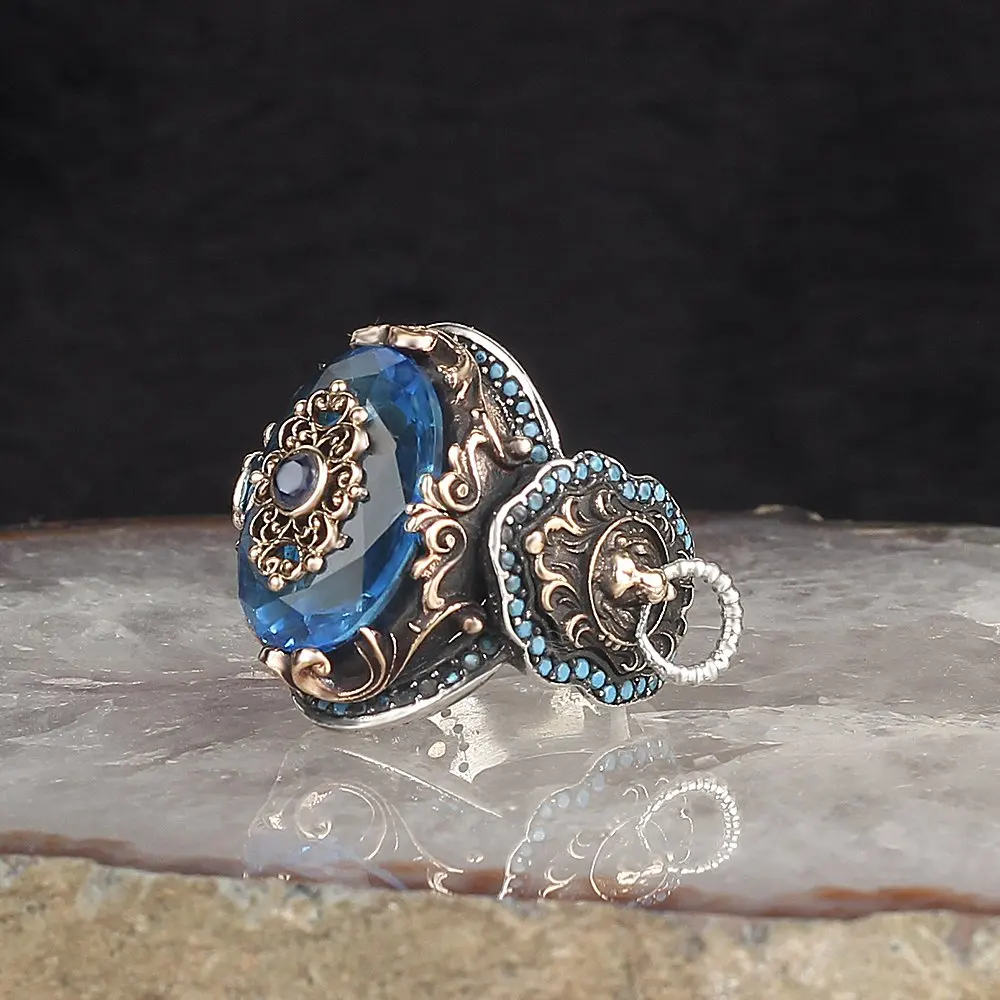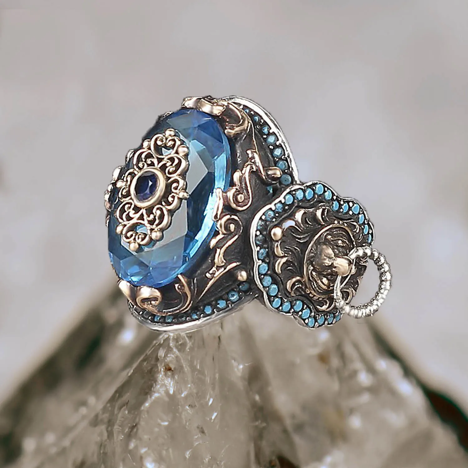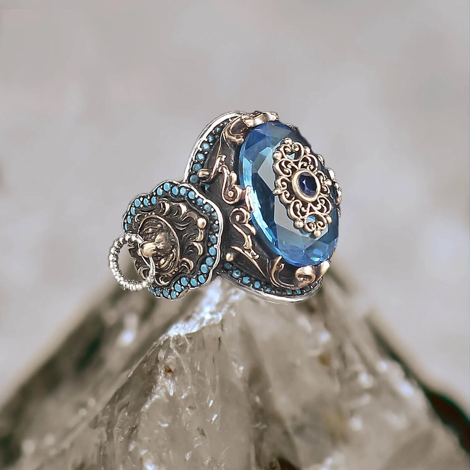 Синий Аквамариновый камень лев Разработанный ручной работы 925 пробы Серебряное мужское кольцо.