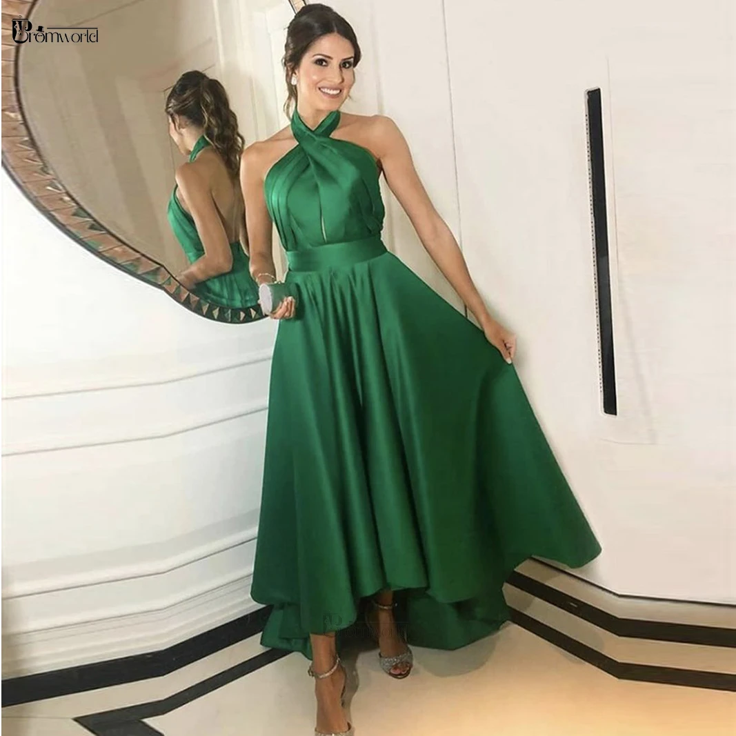 Женское атласное вечернее платье, темно-зеленое ТРАПЕЦИЕВИДНОЕ ПЛАТЬЕ с высоким воротником-халтером, платье для выпускного вечера, 2019