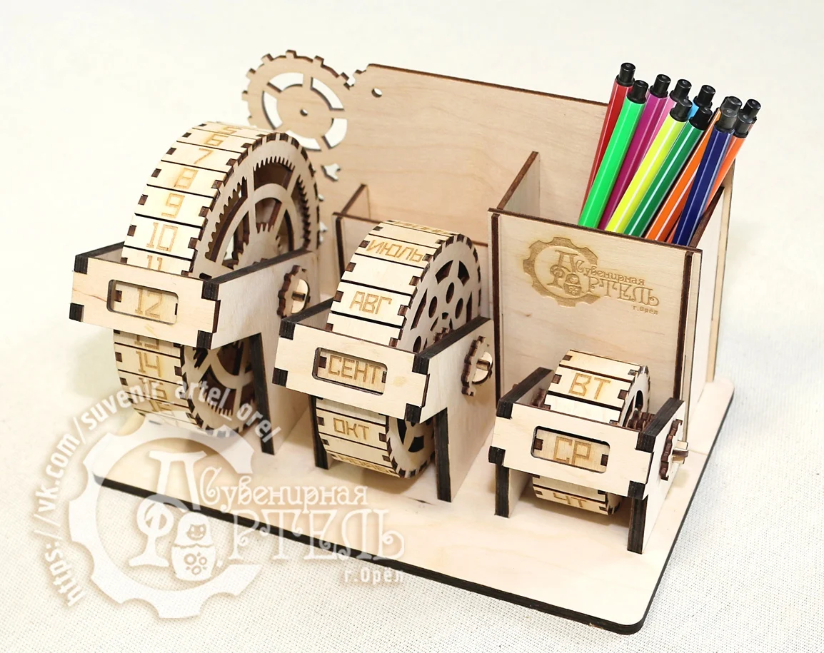"Вечный календарь органайзер с шестерёнками" для карандашей и ручек.Прекрасный подарок как руководителю и офисному сотруднику любого уровня,так и обычному школьнику. С таким органайзером пишущие принадлежностивсегда будут под рукой, а календарь который никогда не закончится будетсообщать вам о текущей дате, месяце и дне недели. Возможнаиндивидуальная персонализация по вашему желанию, которая оплачивается отдельно.