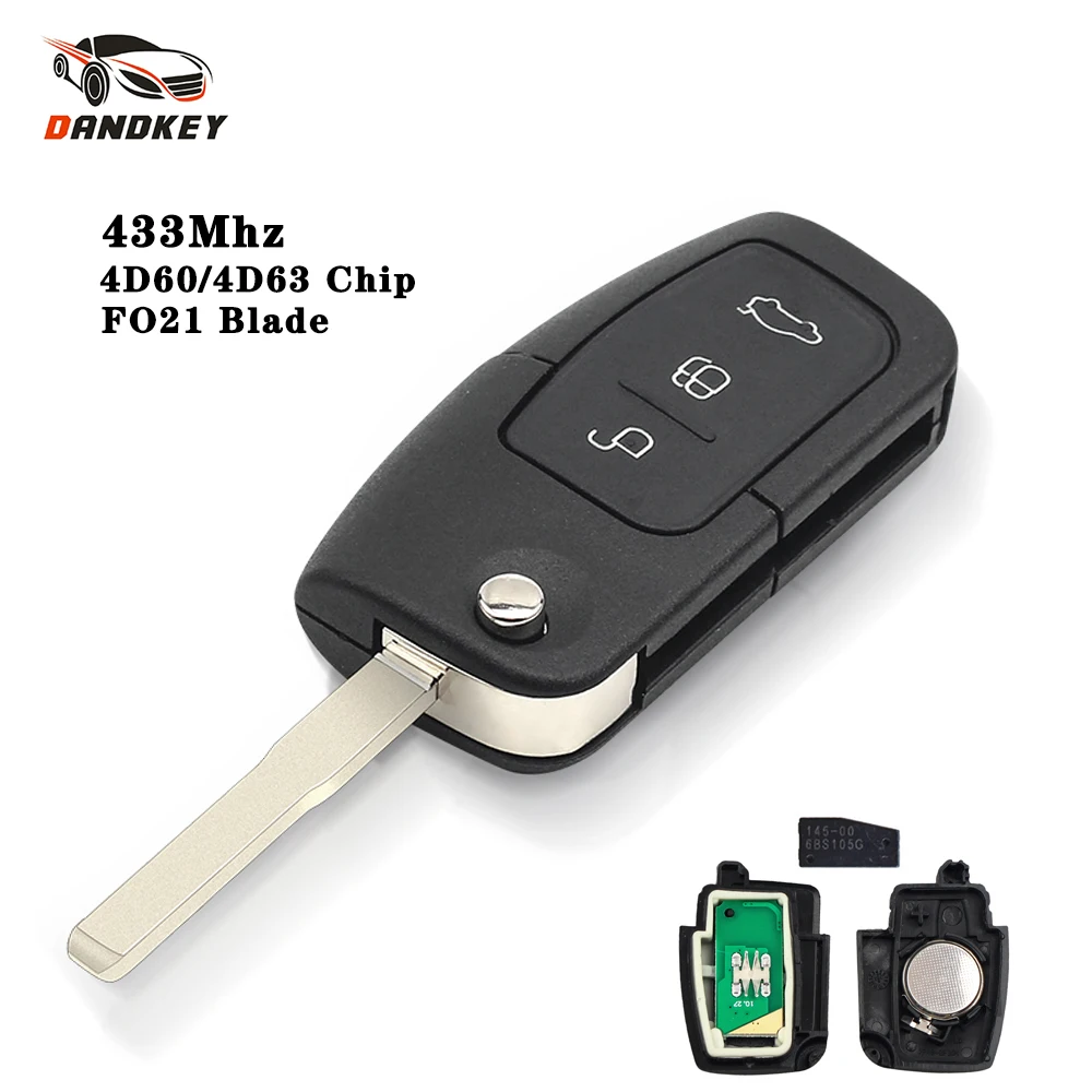 Складной ключ Dandkey для автомобиля, с 3 кнопками, 433 МГц, с чипом 4D60 4D63, бит, для Ford Focus 2, 3, Mondeo, Fiesta, HU101 Blade