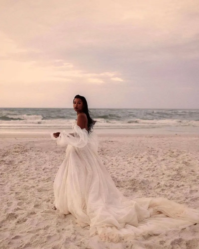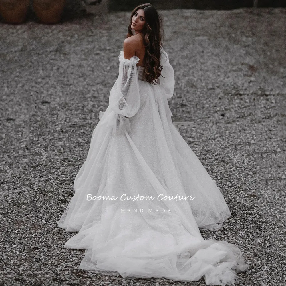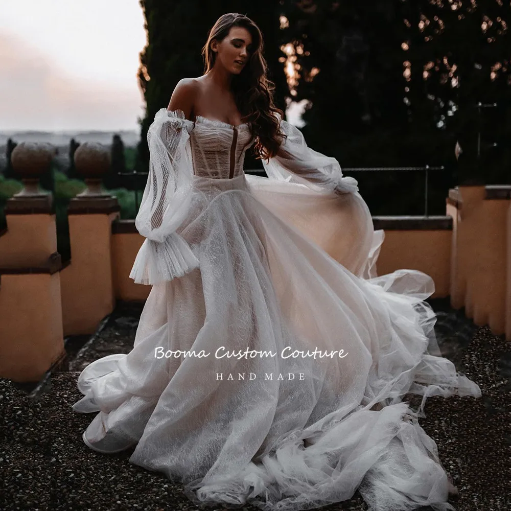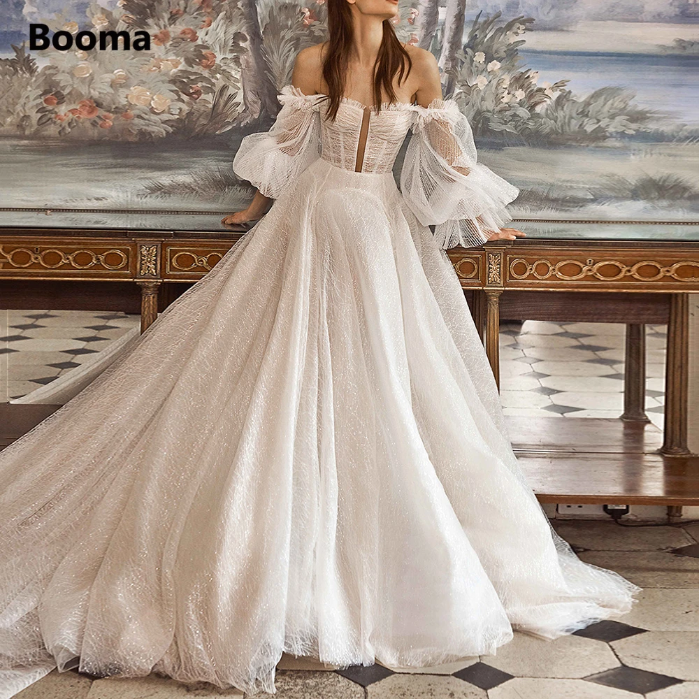 Свадебное платье принцессы Booma, сверкающее Тюлевое платье с пышными рукавами и открытыми плечами, платье невесты с длинным шлейфом, свадебные платья без спинки