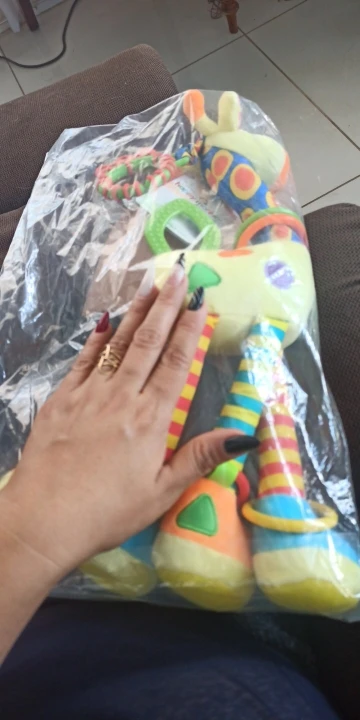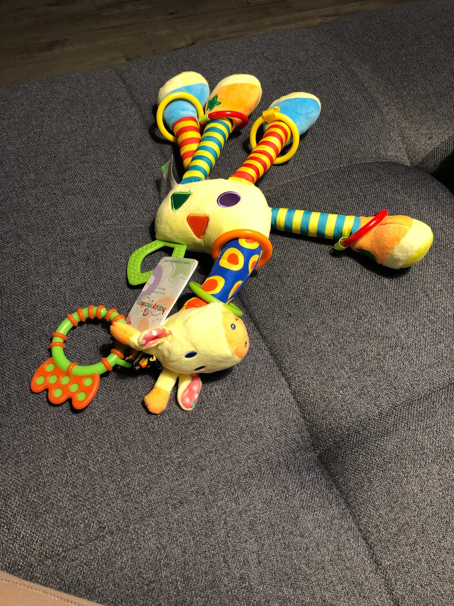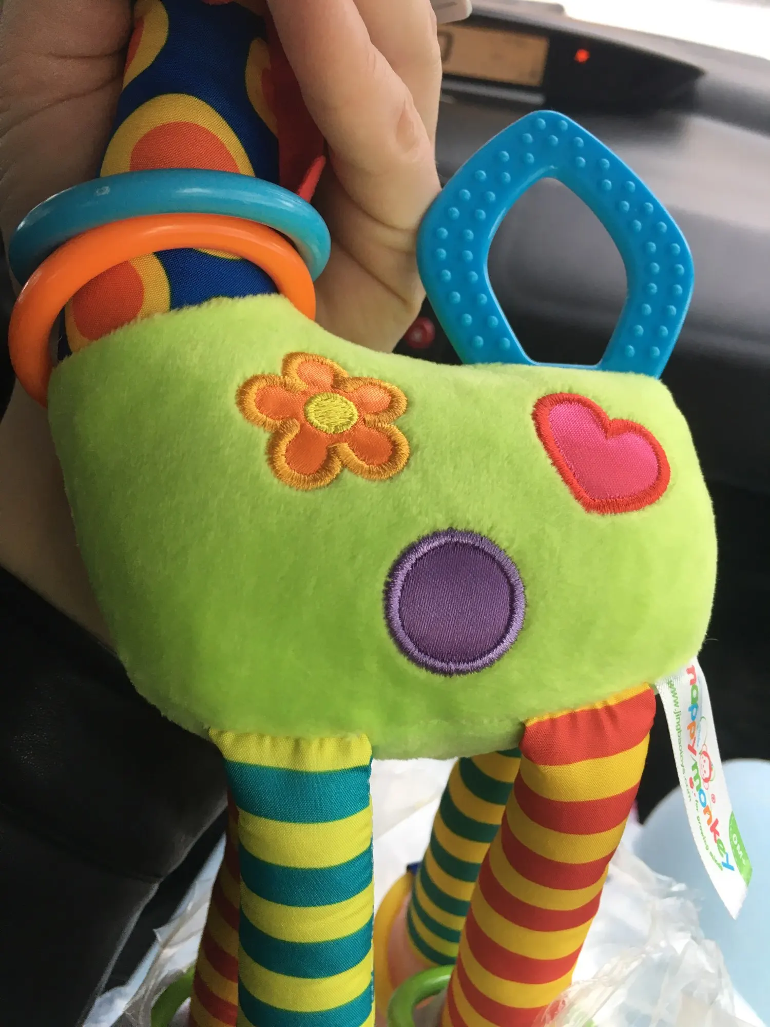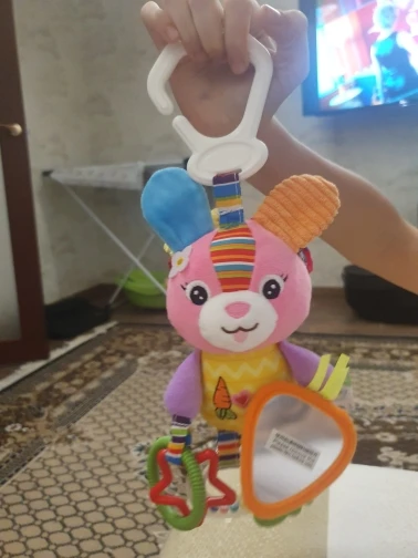 Отличная игрушка. Правда когда я ее выбирала думала что она с вибрацией. Итак: яркая игрушка. Большая! В высоту сантиметров 30 точно ( в коляску лично мне было не удобно крепить), зато в кроватку самое то. Без вибрации в ней ничего не гремит, Нельзя ее оттянуть чтобы она с вибрацией возвращалась в исходное положение. Грызунок на голове очень понравился ребёнку с самого начала и до сих пор не грызёт. Так что классная игрушка. Запаха нет, все прошито очень хорошо, продуманно все. На ножках колечки пришиты чтобы не слетали.