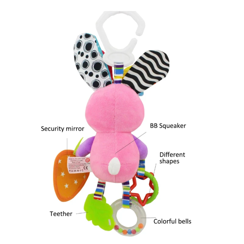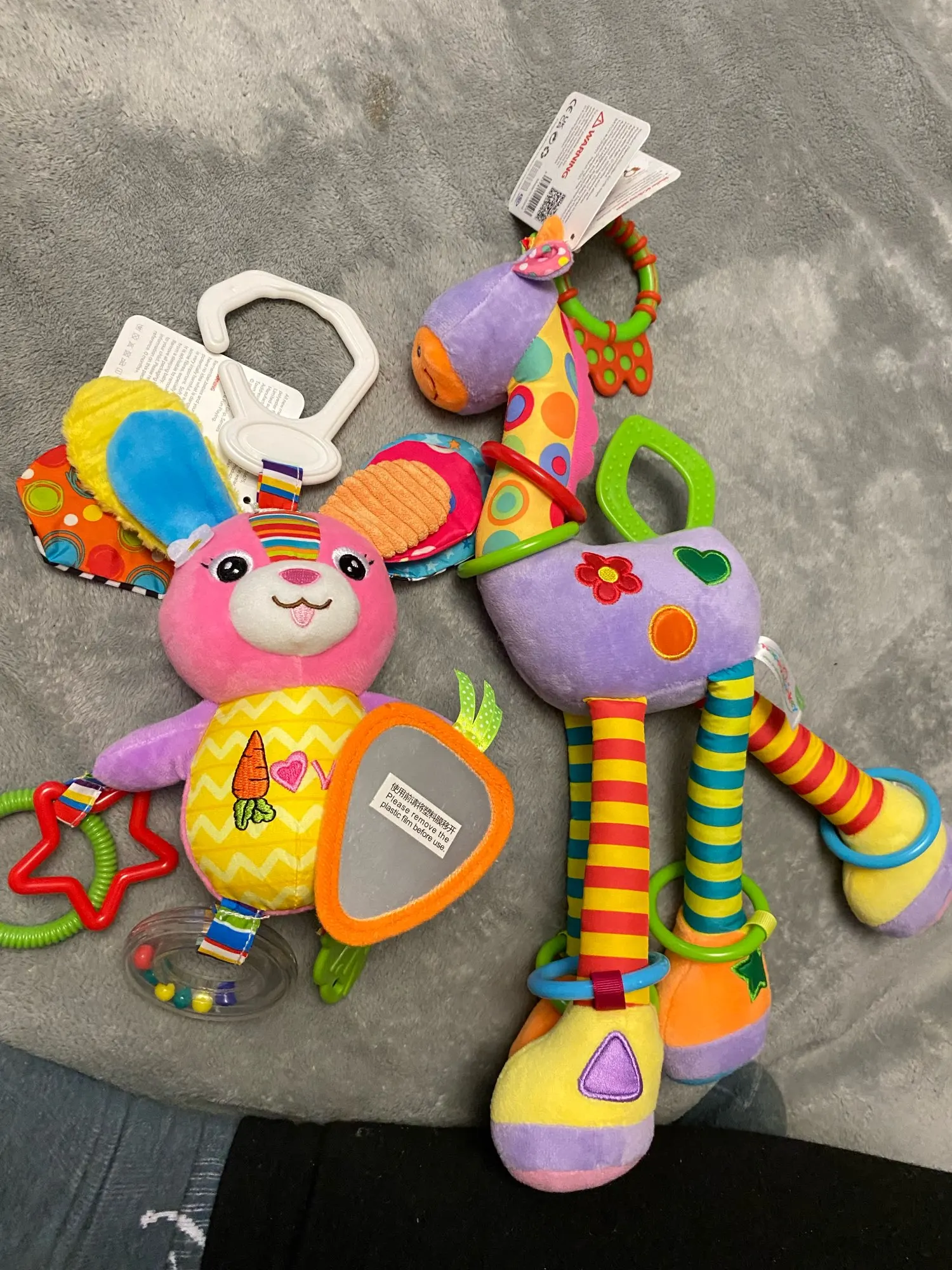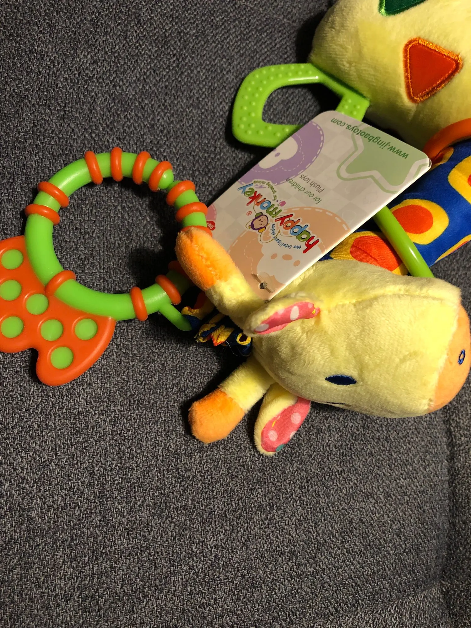 Ушки шуршат, погремушки, одина силиконовая подвеска, остальные пластиковые. Спасибо