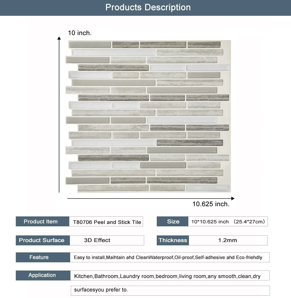 Плитку можно легко установить прямо на существующие панели или на гладкую поверхность. Специально разработан для кухонного щитка и щитка ванной комнаты, плитка устойчива к нагреву печей и влажности ванных комнат.