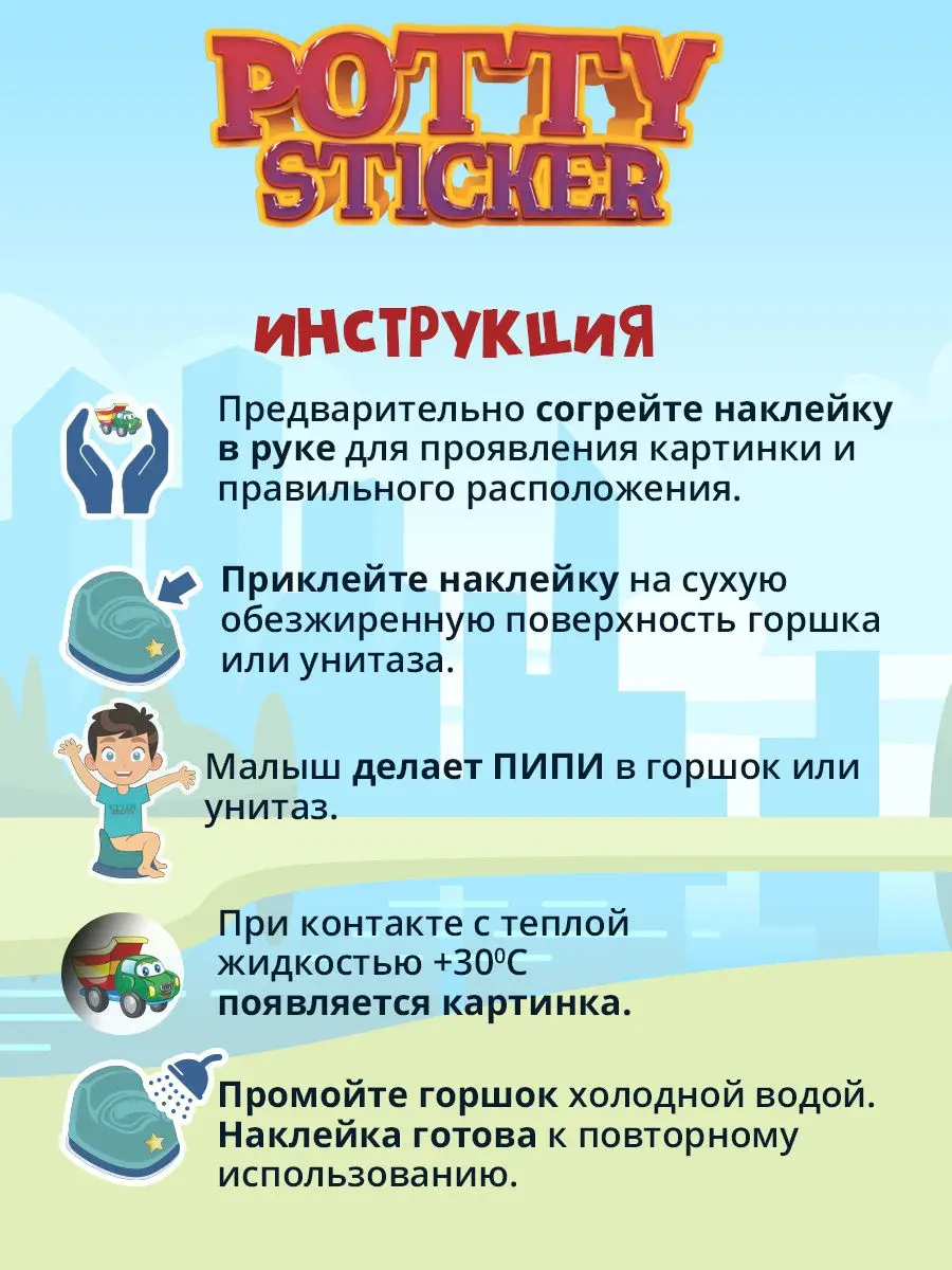 Как работает обучающая наклейка Potty Sticker: при попадании теплой жидкости на наклейку появляется веселая картинка, которая исчезает после высыхания (или ополаскивания под холодной водой) и снова появляется при контакте с теплой жидкостью. СОСТАВ: 100% термовинил, не впитывает запахи. Срок действия одной наклейки 20недель. Подходит для всех типов горшков.