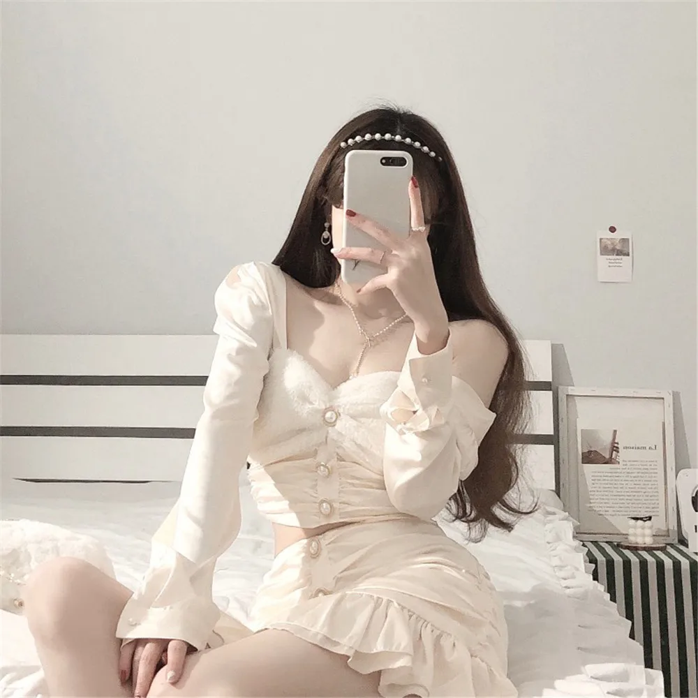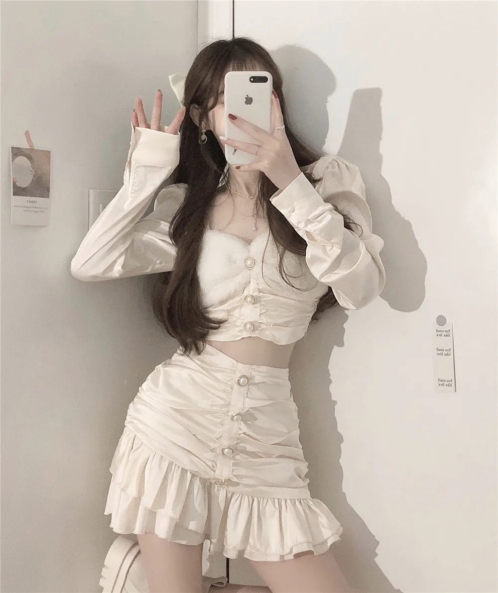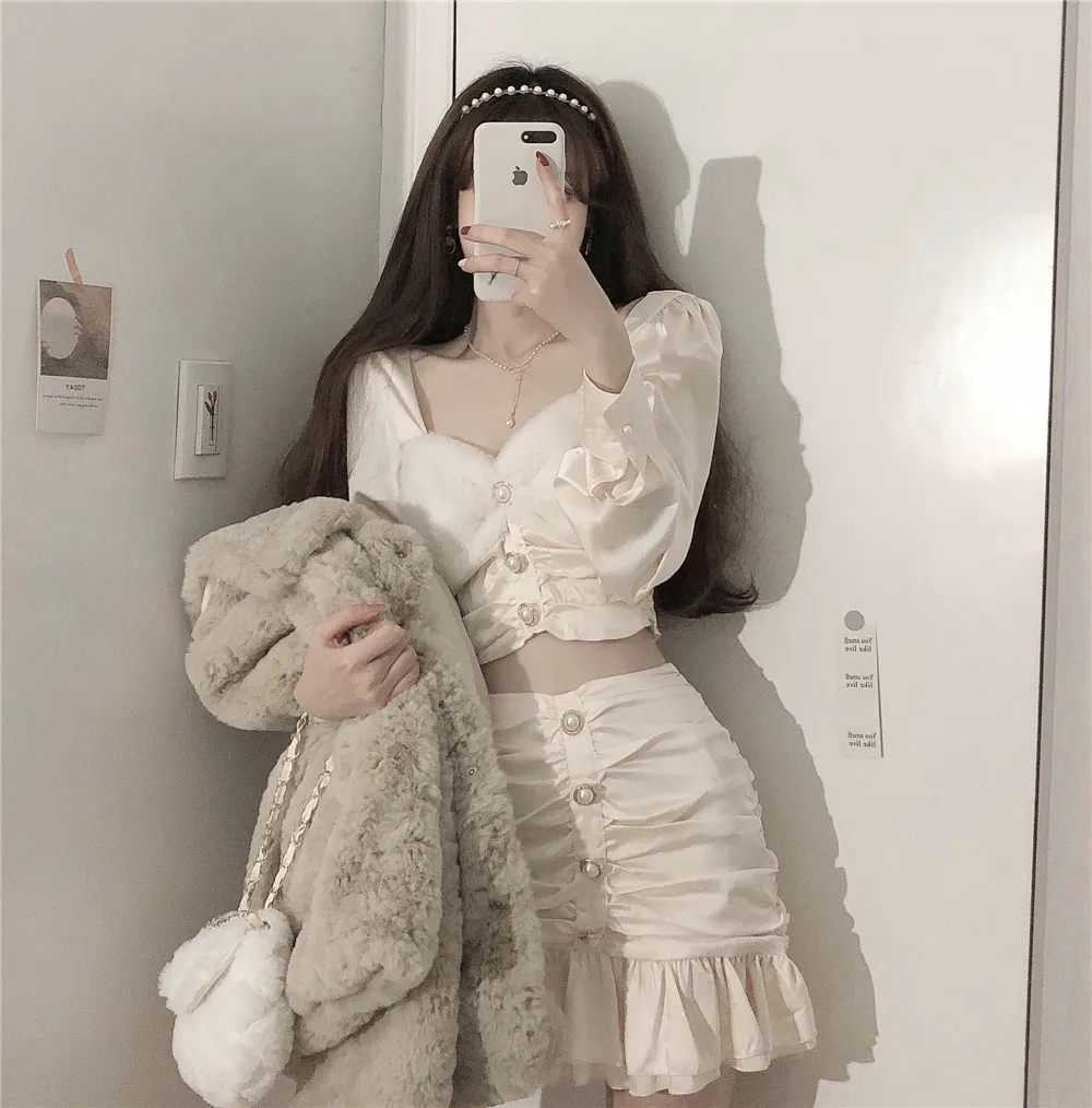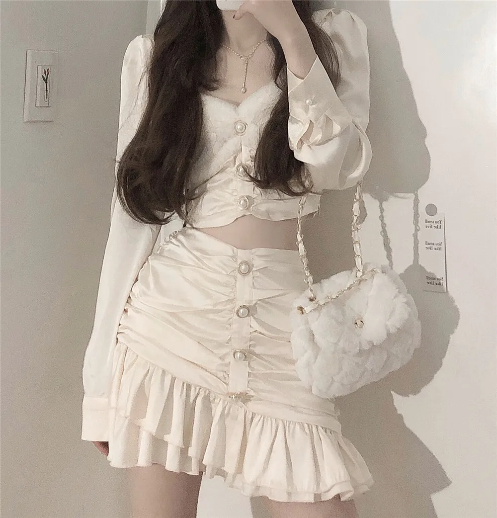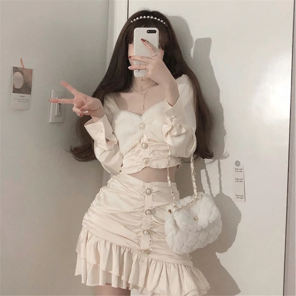 Женский комплект из двух предметов, корейский стиль, рубашка с длинным рукавом и юбка, белые пуговицы, Y2K, элегантная юбка, весна 2021