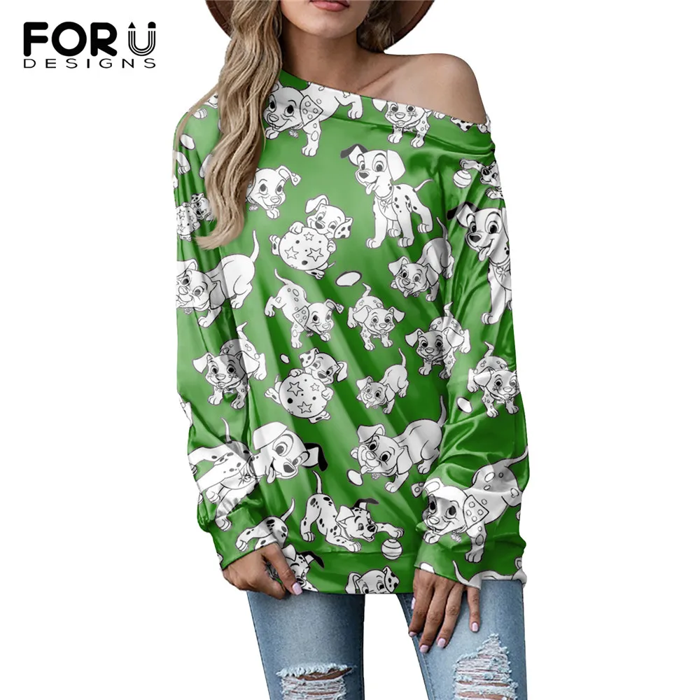 Женские футболки с открытыми плечами FOURDEIGNS, зеленые свободные топы с забавным принтом далматинской собаки, весенняя одежда с длинным рукавом