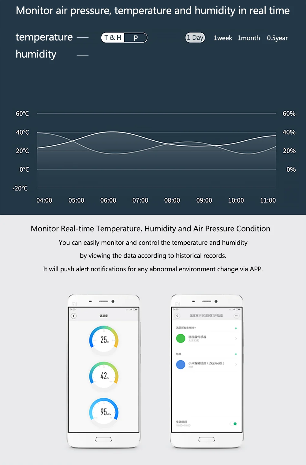 Датчик влажности Aqara может контролировать температуру, влажность и атмосферное давление, а затем может внести изменения в окружающую среду, отправив уведомление на ваш телефон через приложение. Благодаря возможности сопоставления с другими смарт-устройствами Xiaomi, такими как пульт дистанционного управления шлюзом, умная розетка, универсальный контроллер и т. д. этот датчик может помочь вам создать умный дом. Более того, этот умный датчик легко контролировать изменение температуры и влажности, просматривая данные в соответствии с историческими записями.