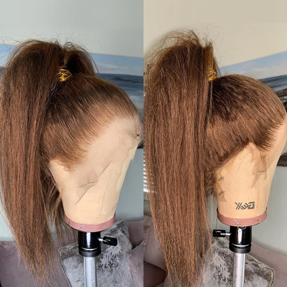 Курчавые прямые коричневые парики на сетке, Remy волосы, предварительно выщипанные Детские волосы Yaki, прямые 180% человеческие волосы на сетке спереди, парики для женщин