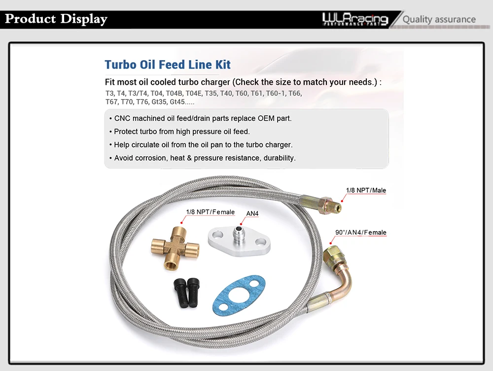 Подходит для большинства турбозарядных устройств с масляным охлаждением (проверьте размер в соответствии с вашими потребностями). : T3, T4, T04E, T60, T61, T60-1, T66, T67, T70, Gt35, Gt45. ....Спецификация: