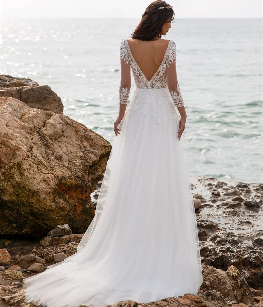 Женское свадебное платье с длинным рукавом, V-образным вырезом и открытой спиной