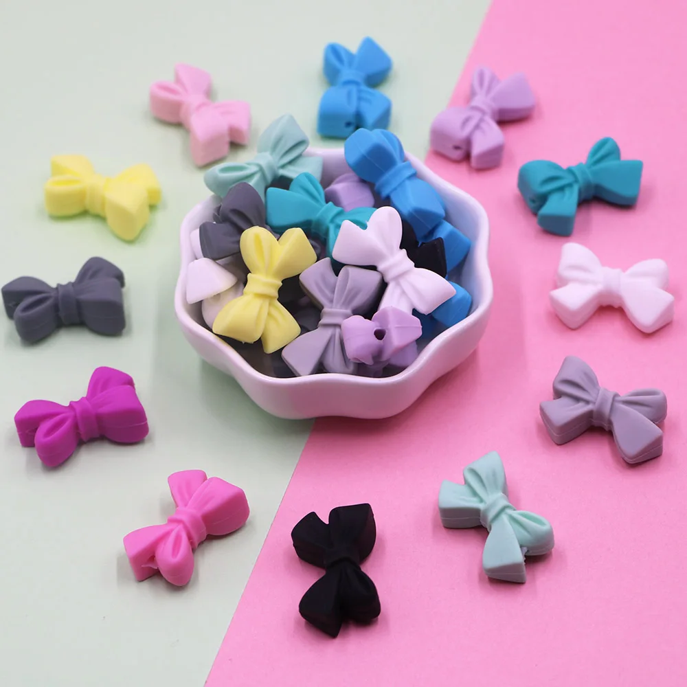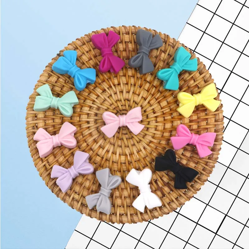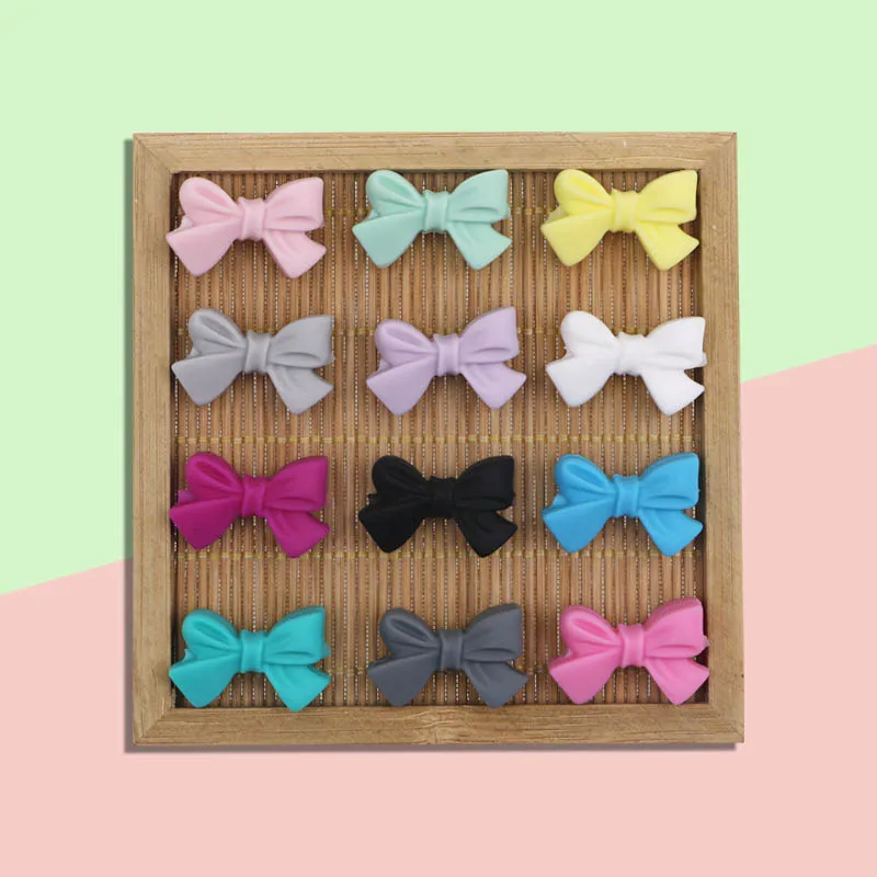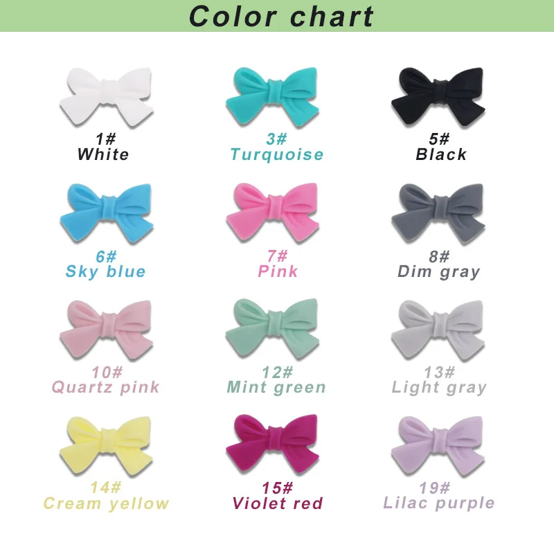 -Bowknot Silicone Beads quantity: 20 pcs size:27mm colors: 12colors -You can leave the color you need in the comment when you place the order. -Stimulates sensory,visual,and motor development. -Silicone Teether provide instant teething relief and gum massage. -100% BPA-free,FDA approved food grade silicone beads.No phthalates,cadimum,lead,PVC or metals. -Easily washable.Recommend disinfectant pacifier wipes. Wash before use! Never leave the product with unsupervised child