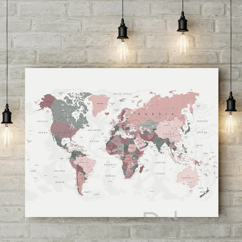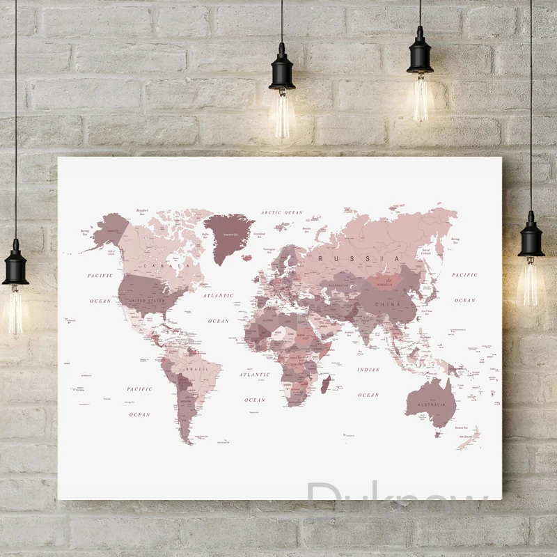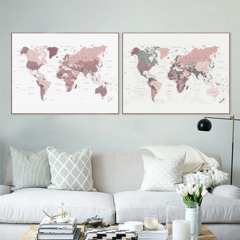 Современная Карта мира, холст, художественные принты и постер, абстрактные румяна, розовая карта мира, картина, настенные картины, декор для гостиной, офиса