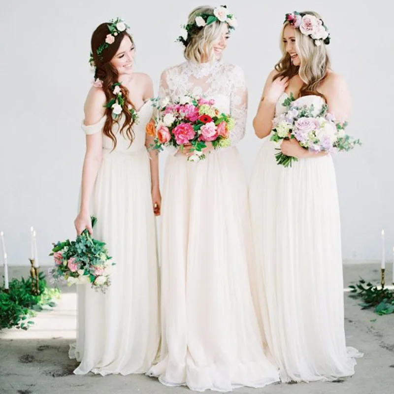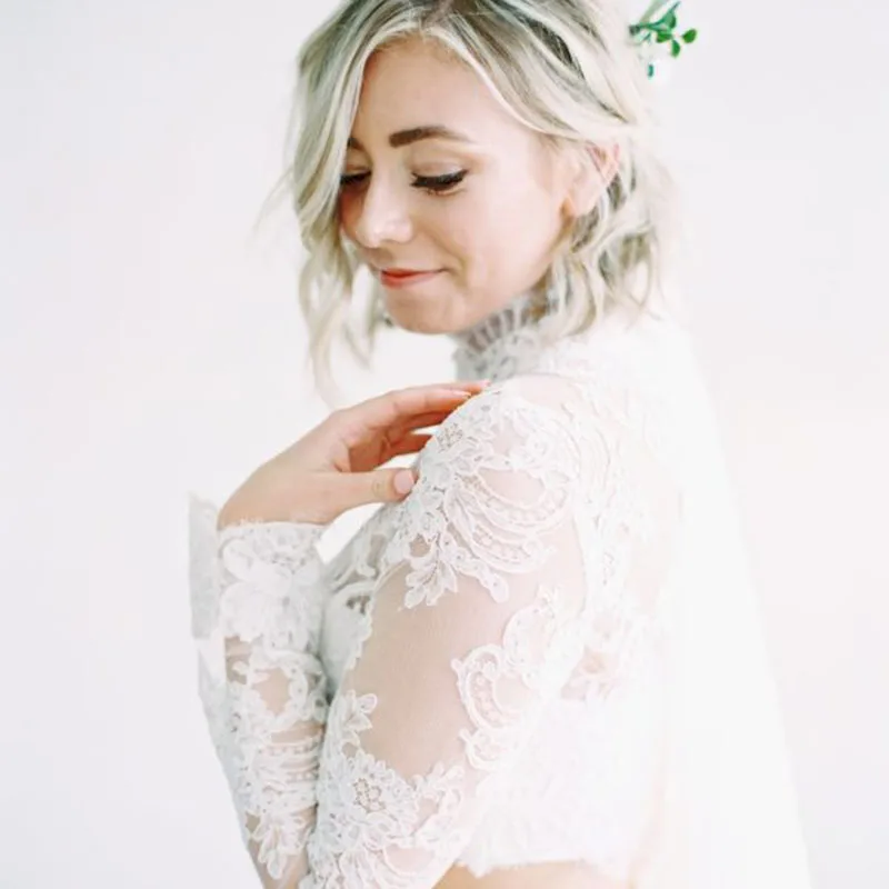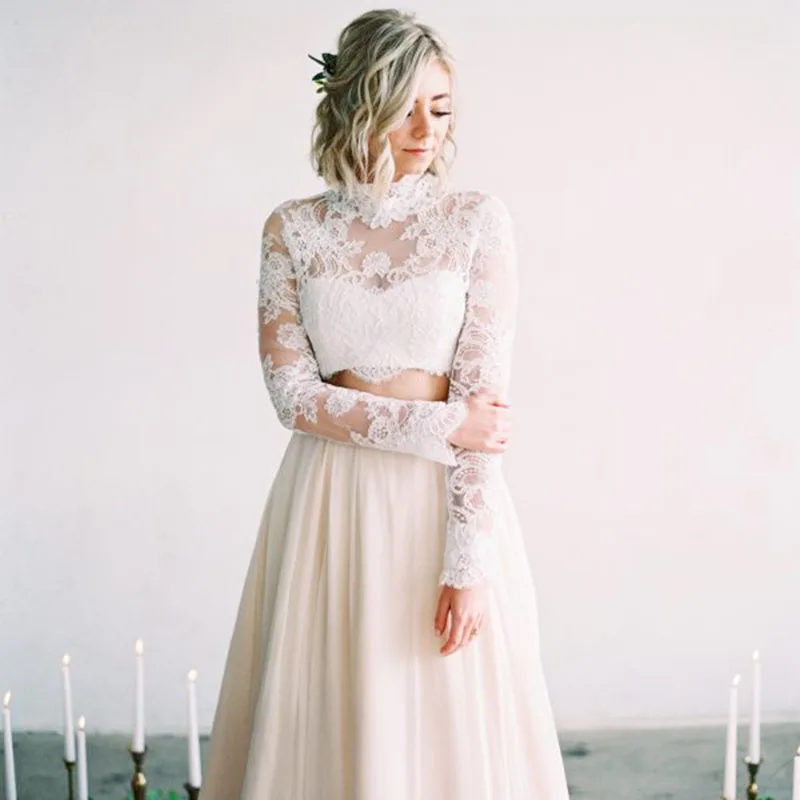 Комплект из двух предметов пляжное свадебное платье-бохо 2021 с высоким воротом и длинными рукавами с аппликацией в виде кружевной топ, а-линейное шифоновое Свадебное платье свадебное платье