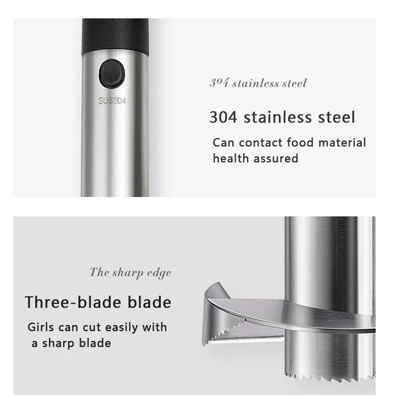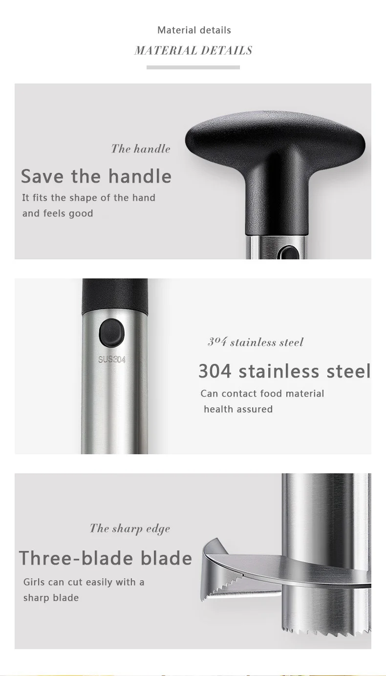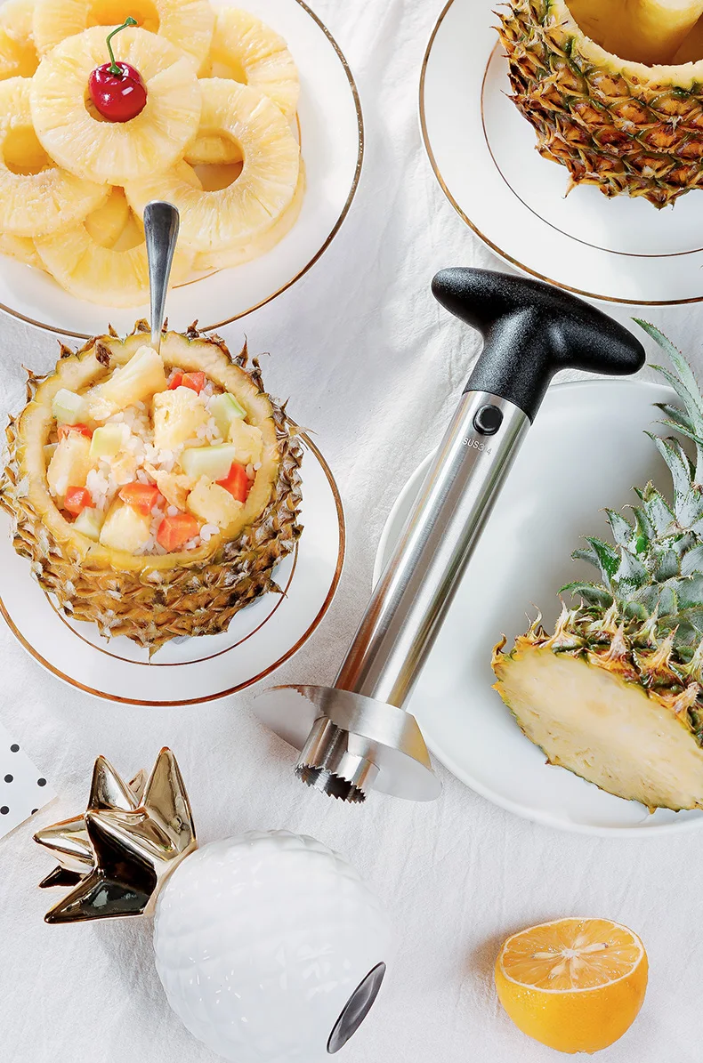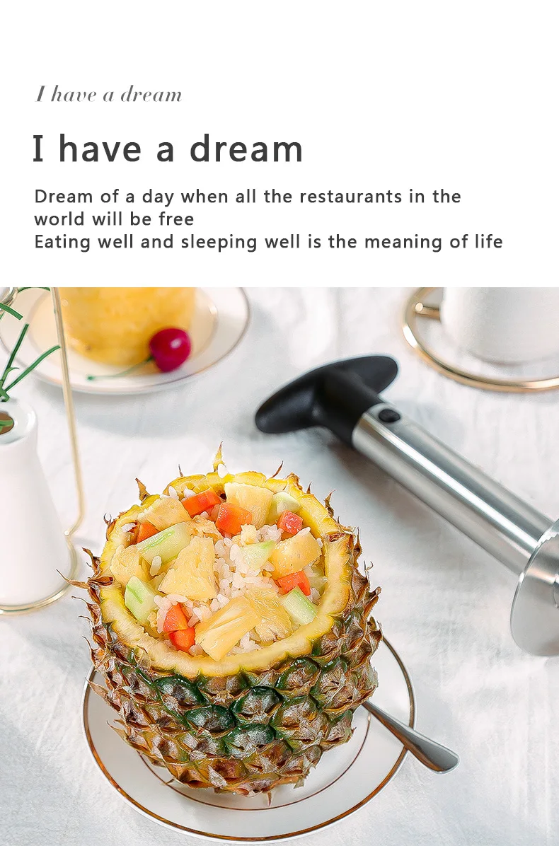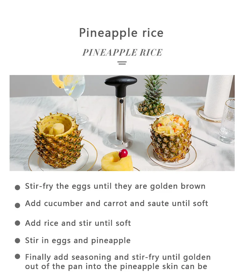 1. Отличный и простой в использовании. 2. Идеально подходит для очистки, сердцевины и нарезки ананасов. 3. Как только мякоть вынимается, скорлупа-это товары для подачи жареных блюд из риса, коктейльных чаш и т. д.