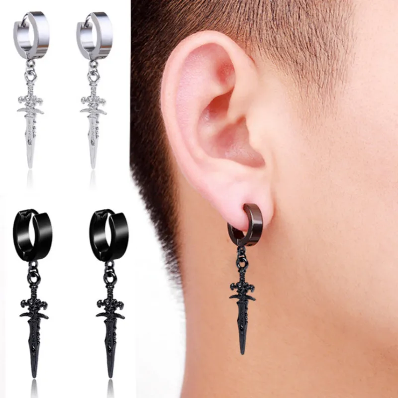 Серьги-клипсы в Корейском стиле для мальчиков и девочек, черные подвески из нержавеющей стали с крестом-мечом без проколов, крутые подарочные украшения вечерние