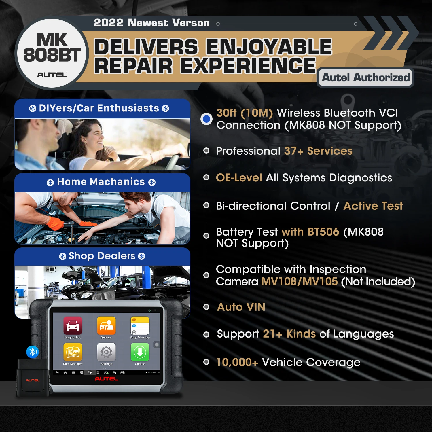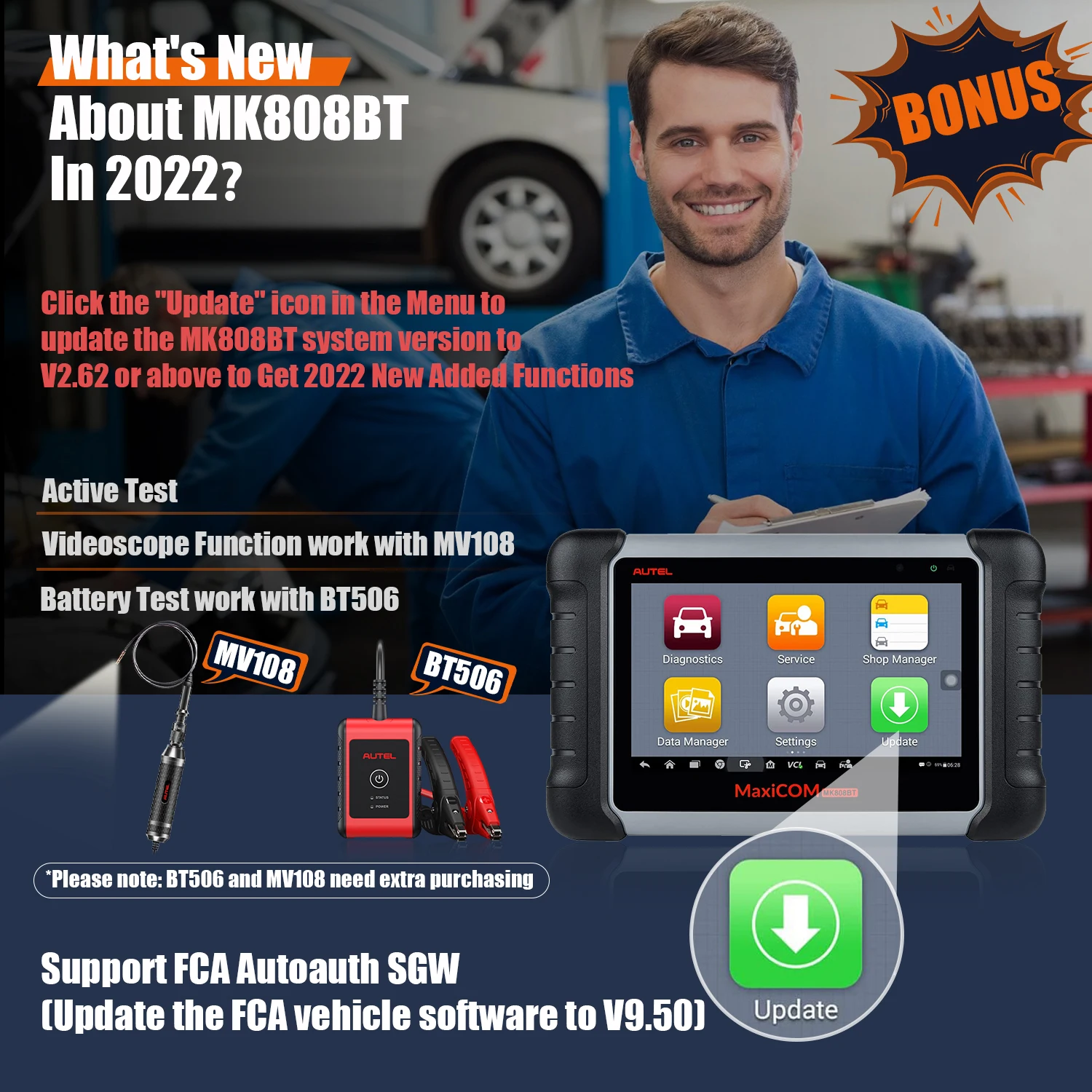 1. Двунаправленный контроль (активный тест)С двунаправленным управлением/активным тестом MK808BT является экономически эффективным сканером, который может выводить команды в ECUs транспортного средства для привода приводов для работы и контроля работы приводов, помогает профессиональным механикам быстро узнать, функционирует ли какая-либо определенная система, компонент или подсистема, чтобы значительно сократить время диагностики.2. 28 + Функции обслуживанияMK808BT диагностический инструмент был модернизирован с более чем 28 сервисными функциями, такими как сброс масла, EPB, BMS, SRS, ABS Bleed, SAS калибровка, DPF поколение, Кодирование инжектора, соответствие дроссельной заслонки, соответствие подвески, TPMS и т. Д. Кроме того, MK808BT может быть постоянно обновлен с большим количеством функций для удовлетворения ваших различных потребностей в обслуживании.3. Поддержка MV108 инспекционной камеры, поддержка BT506 батареи и электрической системы анализа инструментаMV108 превращает ваш планшет MK808BT в область видеоосмотра, позволяя вам изучить труднодоступные области, которые обычно скрыты от глаз. Он способен записывать цифровые неподвижные изображения и видео, что предлагает Вам экономичное решение для проверки техники, объектов и инфраструктуры безопасным и быстрым способом.BT506 позволяет техникам просматривать состояние здоровья батареи транспортного средства и электрической системы. Загрузите бесплатное и простое в использовании мобильное приложение, доступное для устройств iOS и Android, чтобы использовать с BT506 для тестирования и отображения результатов тестирования.Примечание: MV108/BT506 необходимо покупать отдельно в этом магазине. (Не стесняйтесь связаться с нами, чтобы получить помощь)4. Больше языковАнглийский, немецкий, испанский, японский, португальский, голландский, польский, шведский, французский, итальянский. Корейский, русский, персидский, турецкий, тайский, вьетнамский, иврит, арабский, индонезийскийПримечание: Пожалуйста, оставьте S/N машины для авторизации языка, который вы хотите после получения. (S/N можно найти за устройством или на странице о инструменте-«Maxisys-> Настройки-> О нас»)