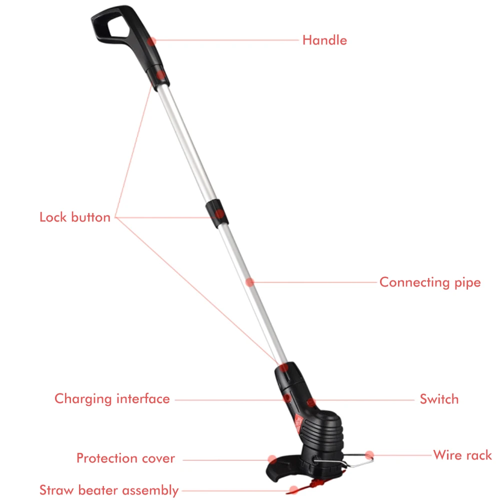 Точки пули: 1. Дизайн зарядки: этот триммер является беспроводным и поддерживает зарядку. Не нужно переносить тяжелую и проблемную проводку. 2. Зеленый и охрана окружающей среды: он не использует топливо и очень экологически чистый. 3. Портативный Размер: головка продукта отстегивается, удобна в переноске и очень проста в эксплуатации. 4. Безопасно для использования: Замените металлическое лезвие на кольцо с молнией, которое не повредит бетон или камень при прикосновении. 5. Мощный: 18000 об/мин, легко скашивать.