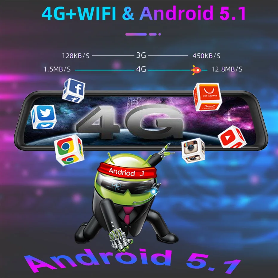 Видеорегистратор 4G на зеркало заднего вида, 10 дюймов, WIFI, GPS