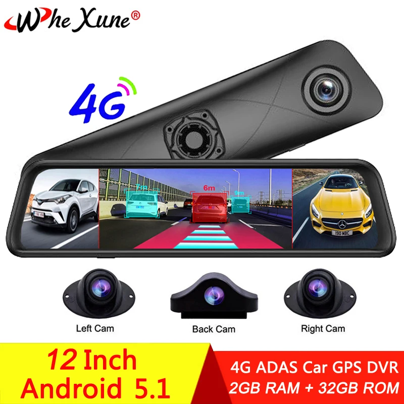Автомобильный видеорегистратор WHEXUNE, 4G, 12 дюймов, 4-канальный объектив, GPS, видеорегистратор FHD 1080P, Wi-Fi, зеркало заднего вида, видеорегистратор с креплением