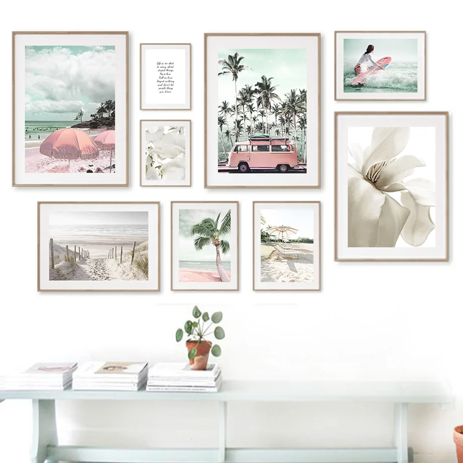 Розовая пляжная доска для серфинга, зонт, кокосовое дерево, настенн...