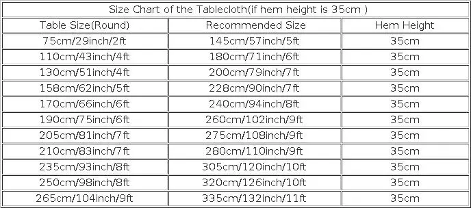 Если ваш размер стола составляет 150 см, вам нужна высота подола 35 см, скатерть 150 см + 35 см * 2 = 220 см (высота подола зависит от вас), так что вам нужно купить скатерть 220 см.
