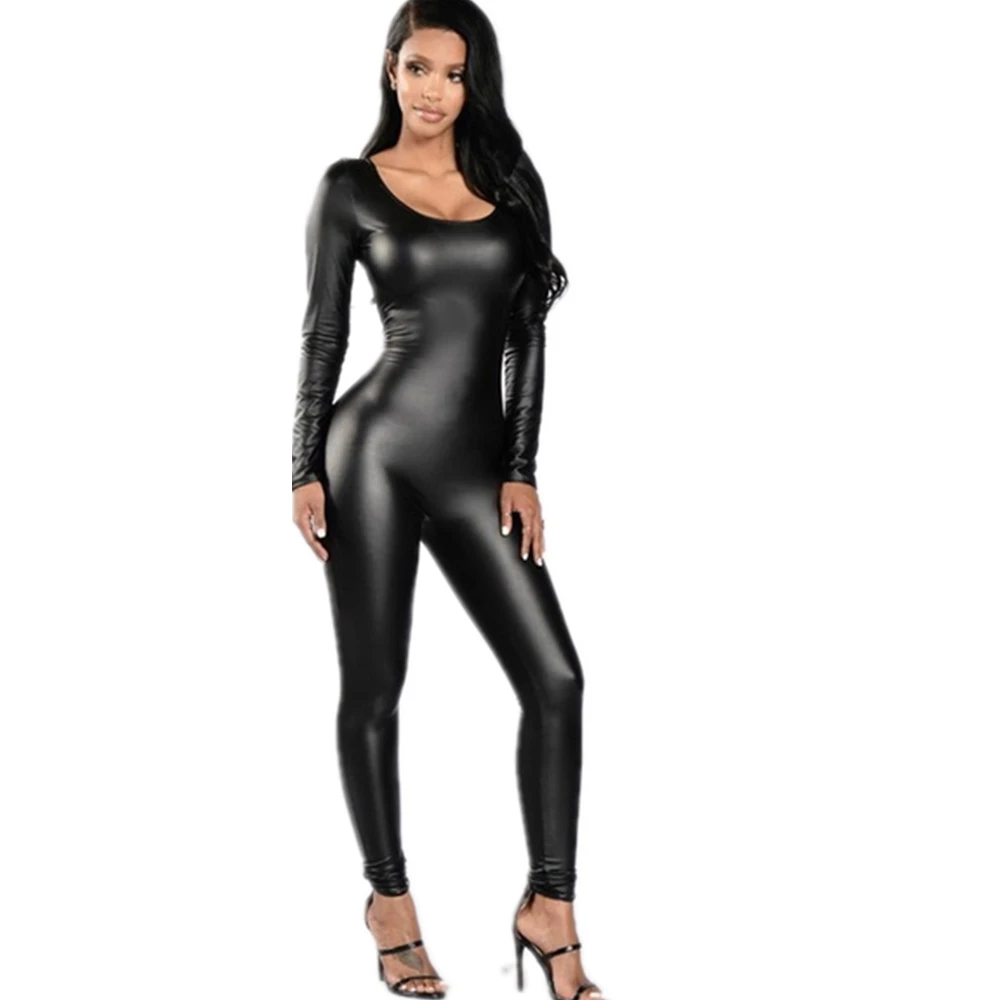 Комбинезоны для женщин, черные кожаные латексные Комбинезоны на молнии, боди, Женский пикантный эластичный костюм с длинным рукавом, модель 2021
