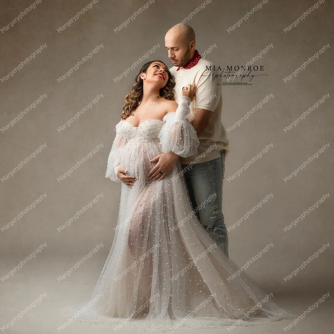 Шикарные тюлевые платья для беременных с жемчужинами пышные рукава ...