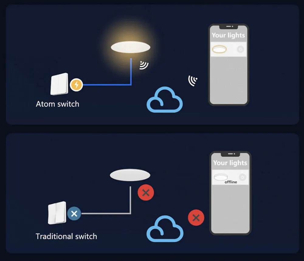 Технология Atom SLISAON-это перспективная инновация, инициированная Yeelight для обеспечения того, чтобы Умные Огни всегда были в сети. Он не изменяет привычки взаимодействия оригинального настенного выключателя и не увеличивает стоимость оригинальной системы переключения. Аппаратная схема и алгоритм программного обеспечения объединены на лампе. После того, как настенный выключатель выключит светильник, умный светильник все еще находится в сети, и умные операции, такие как Голосовое управление, автоматизация и дистанционное управление, все еще могут быть выполнены. * Требуется переключатель, который поддерживает управление SLISAON.