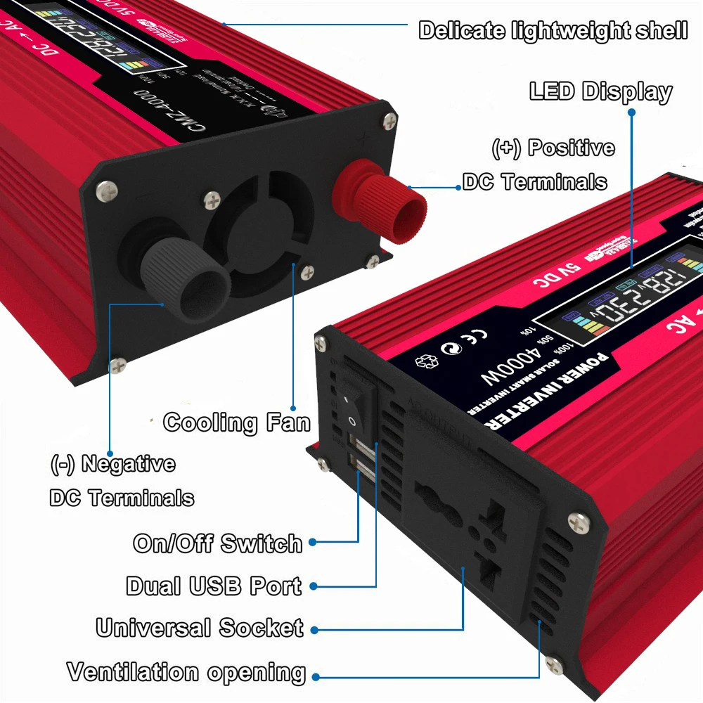 Adavantage:[Автомобильный инвертор] Автомобильный инвертор с 2 usb-портами и одним выходом переменного тока. Инвертор питания поставляется с бесплатной прикуривателем и 2 зажимами для батарей, Обеспечивая непрерывную мощность 300 Вт, максимальная мощность 4000 Вт (убедитесь, что общая номинальная мощность подключенных устройств ≤ 300 Вт). Кабель прикуривателя может легко поставить питание для устройства. Если выходная мощность выше 150 Вт, пожалуйста, используйте зажимы типа «крокодил» для аккумулятора.[Светодиодный зеленый и красный рабочие Огни] Когда инвертор работает нормально, зеленый светодиодный свет работает и говорит вам, что он работает хорошо, но когда он находится на состоянии защиты, например, низкое напряжение, высокое напряжение, перегрев или перегрузка, Красный светодиодный светильник s будет светильник и вам нужно, чтобы выключить инвертор, и проверить, какие функции защиты работает, и попытаться решить его, а затем инвертор может работать снова.[Интеллектуальный ЖК-дисплей напряжения] Цветной смарт-ЖК-дисплей показывает входное напряжение батареи, выходное напряжение, емкость батареи, частоту 50 Гц или 60 Гц, грузоподъемность в режиме реального времени, который может помочь вам узнать состояние инвертора удобно.[Быстрая зарядка с двумя портами USB] одна розетка переменного тока и два порта зарядного устройства usb (макс. 4,2a) для одновременной работы, и он может предложить 100% быструю зарядку для мобильных телефонов, компьютеров, ноутбуков, молокоотсос, распылитель, бритва, медицинское спасательное устройство, Аварийное оборудование и т. д. легко удовлетворить потребности источника питания различных транспортных средств электроприборов и может быть в качестве аварийного источника питания.[Мульти Защита] Встроенный предохранитель, безопасная конструкция зарядки и охлаждающий вентилятор предотвращает автомобильный преобразователь питания от перегрева, экономии энергии и энергии, перенапряжения, перегрузки, перегрузки по току, короткое замыкание, понижение напряжения, перегрев, защита от короткого замыкания.[Легкий дизайн и высокое качество] Легкий и компактный, идеально подходит для отдыха, кемпинга и рабочих поездок. Его можно подключить практически к любому выходному транспортному средству питания 12 В, обеспечивая возможность зарядки в любом месте.[То, что вы получаете] 1 X автомобильный инвертор, руководство пользователя, 2 x зажим батареи, 1 x разъем для автомобильной сигареты и 100% обслуживание клиентов.Применение:-Применимые нагрузки для номинальной мощности до 300 Вт:5w-сотовый телефон5w-молокоотсос10w-цифровая электроника (Ipad/Автомобильная Навигация/Цифровая камера)10w-игровая консоль5 Вт-10 Вт электробритваСветодиодная лампа 20 Вт25w-рацияНоутбук 50-100 Вт60w-компактная люминесцентная лампаЛампа накаливания 60w-60w-механический Электрический вентилятор 9Телевизор 60 Вт-150 Вт80w-видеомагнитофон180w-настольный компьютерВнимание!-1. Это модифицированный синусоидальный инвертор, не подходит для устройств, которые работают со встроенным мотором, фены, кондиционеры, кофемашина, водяной насос, индукционная плита, холодильники и микроволновые печи и т. д. Убедитесь, что общая номинальная мощность подключенных устройств ≤ 400 Вт-2. Затяните положительные (+) и отрицательные (-) клеммы при использовании автомобильного конвертера-3.е