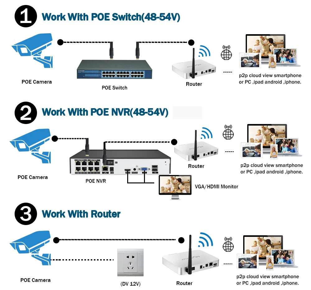 Простая настройка, всего 4 шага для просмотра мобильный телефон, просмотра видео в режиме реального времени из любого места и в любое время с помощью смартфона,Таблица или ПК с передовой технологией P2P, вы можете получить удаленный доступ к вашей системе в течение нескольких минут или меньше, нет необходимости в переадресации,Удаленный доступ никогда не был таким простым!