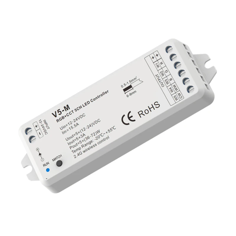 Этот 5-канальный беспроводной приемник может сочетаться со всеми пультами дистанционного управления SkydanceРаботает как контроллер затемнения при подключении к пульту дистанционного управления затемнениемРабота как контроллер RGB RGBW при подключении к пульту RGB RGBW.Работает как контроллер RGBCCT при подключении к пульту ДУ RGBCCT.