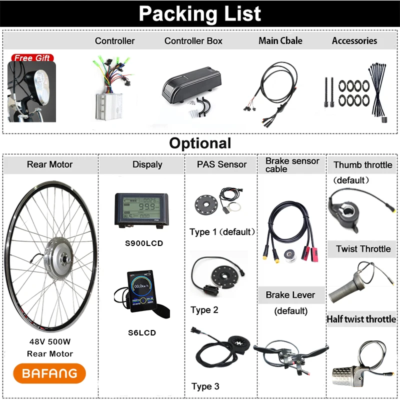 Этот комплект поставляется со всем, что вам нужно для преобразования вашего велосипеда в электрический велосипед, включая аккумулятор и зарядное устройство. Вот список упаковок:(1) 1 * мотор-колесоBAFANG 48v 500w переднее мотор для центрального движения колесаРазмер обода: 26 ", 700C(28")(2) 1 * Датчик скорости и датчик дисковой пластины (PAS)(3) 1 * дисплей (S900 или S6 LCD)(4) 1 * Водонепроницаемый основной кабель(5) 2 * выключатель тормоза/Датчик тормоза(6) 1 * дроссельная заслонка (дроссельная заслонка большого пальца или половина закрутки или закрутка дроссельной заслонки)(7) 1 * контроллер(8)1 * блок контроллера(9)1 * головной светильник(10) другие аксессуары