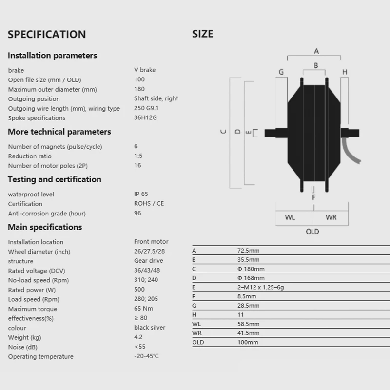 Модель: BAFANG 48V 500WДиаметр колеса (дюйм): 26 "/700C/28")--- опциональноКонструкция: привод передачНоминальное напряжение (DCV): 48Номинальная мощность (W): 500Эффективность (%)≥ 80Цвет: серебристыйВес (кг): 3,3 кгУровень шума (дБ)< 55Рабочая температура: -20-45 ℃
