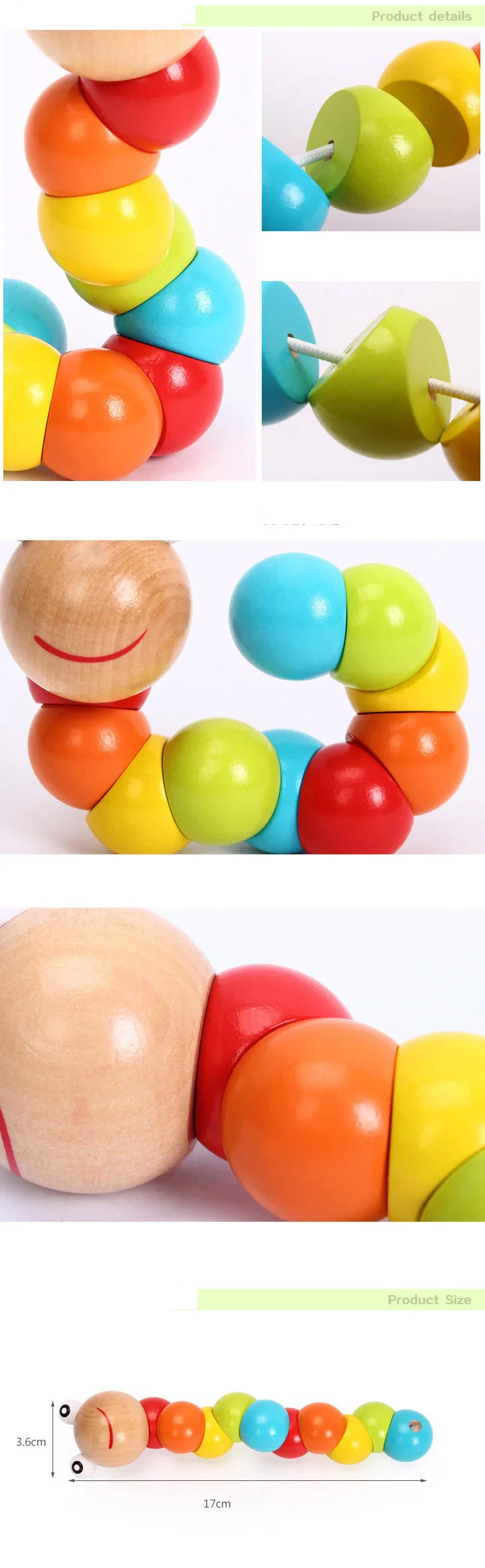 Материал: деревоЦвет: как на картинкеТип: разноцветная гусеница, зеленый крокодил, цветной червьОсобенности:1. Высококачественная древесина, Экологичная краска на водной основе, безопасна.2. В сочетании с цветными трехмерный веер через эластичные ленты, Жук может качаться по желанию.3. Это очень мило, ребенку понравится.4. Это помогает укрепить познание ребенка формы, цвета.5. Это модное и гладкое прикосновение.6. Он может тренировать ловкость пальцев ребенка и координацию рук и глаз, а также стимулировать развитие мозга.Посылка включает в себя: 1 шт. * деревянные игрушки
