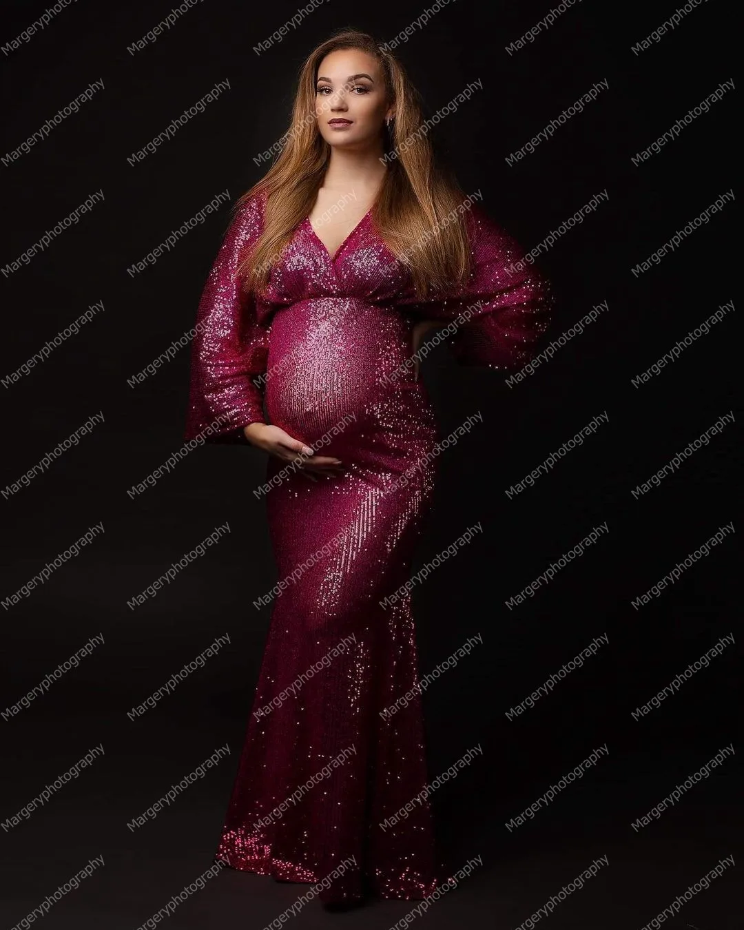 Блестящие женские платья для беременных с пышными рукавами в форме русалки с V-образным вырезом Длинные женские платья для беременных