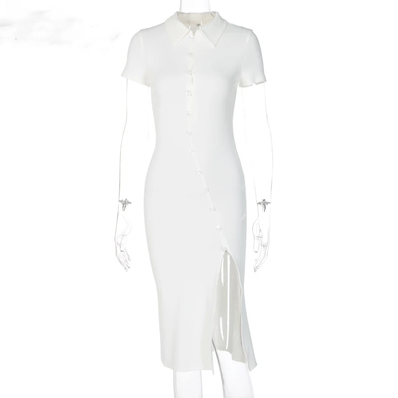 Платье женское в рубчик, на пуговицах, с разрезами по бокам, с отложным воротником, с коротким рукавом, Осень-зима