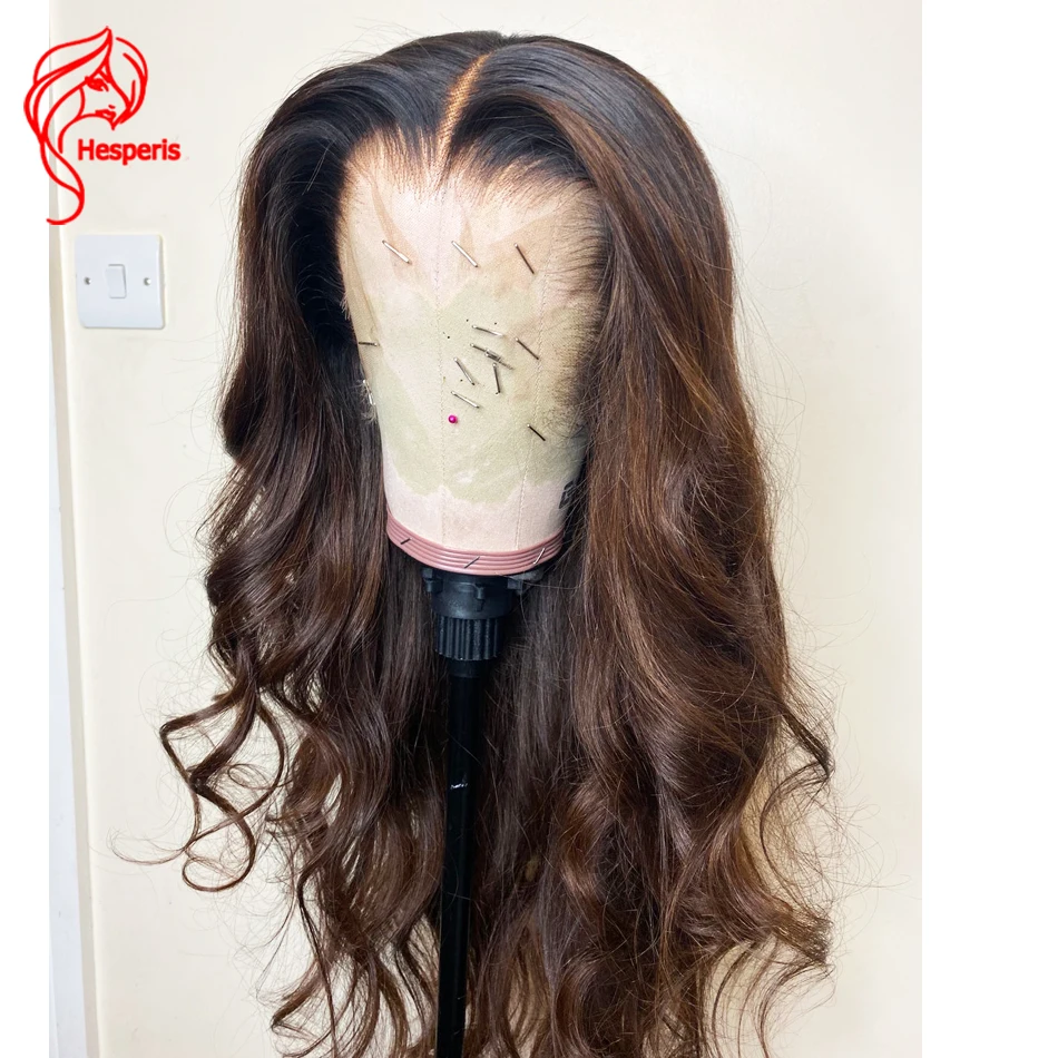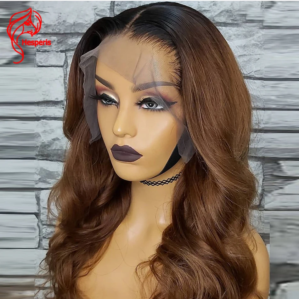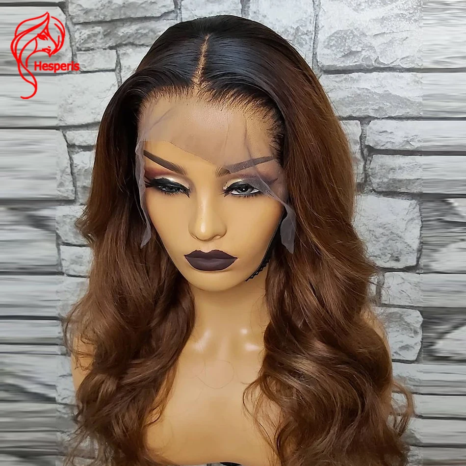 Hesperis Ombre Человеческие волосы, парики с предварительно заправленными детскими волосами, бразильские волосы Remy Borwn 13x 4, парики из человеческих волос на фронтальной сетке, волна, плотность 180
