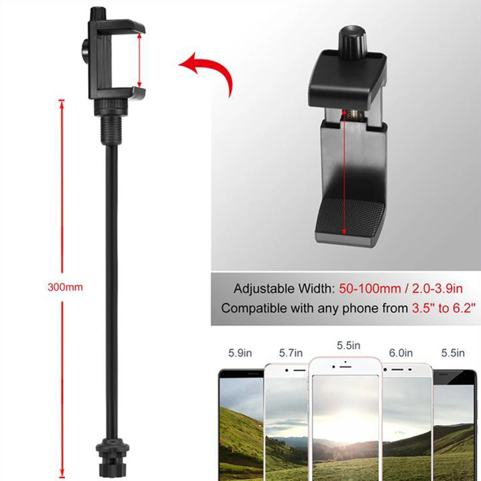 Изготовлен из квалифицированного нейлонового материала, прочный, легкий и высокопрочный Корректируемый, чтобы соответствовать 2,0-3,5 "Ширина телефонов. Конструкция для установки. (Основание не включено). 11 дюймов гибкий длинные руки, 360 градусов Регулируемая. Верхняя Гайка плотно прикручивается после установки телефона в держатель.