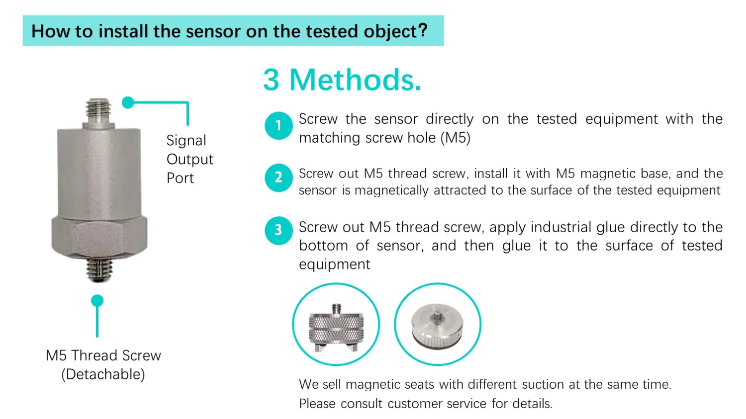 Ответ: метод 1: обычно в нижней части датчика имеется внутренняя резьба M5, которая оснащена одним из наших винтов в качестве стандарта. Клиенты могут изготовить мужские или женские нити на собственном оборудовании, чтобы припарковать наши датчики.Метод 2: вы можете выбрать нашу одноразовую магнитную камеру установки, чтобы зафиксировать Наш датчик на поверхности объекта, который будет измерен.Метод 3: может быть непосредственно приклеен к поверхности измеренного объекта заказчика с помощью клея.