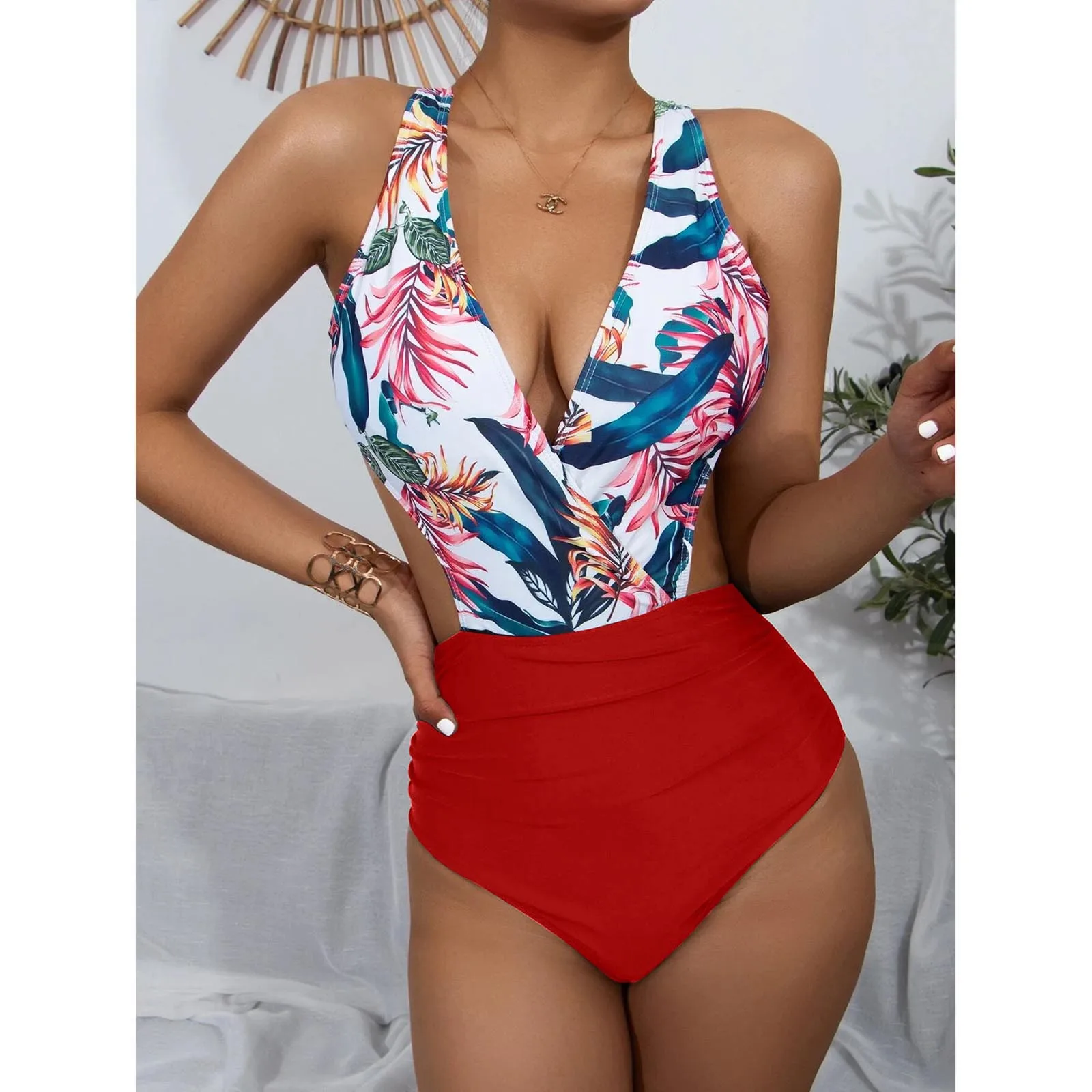Бикини с принтом листьев, Цельный купальник с высокой талией и глубоким V-образным вырезом, сексуальный комплект бикини с эффектом пуш-ап, бюстгальтер с подкладкой, купальник, женский купальник, купальные костюмы 2021