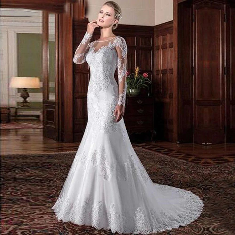 Женское платье с юбкой годе, кружевное Прозрачное платье с длинными рукавами, круглым вырезом и аппликацией, из тюля, на пуговицах сзади, 2021