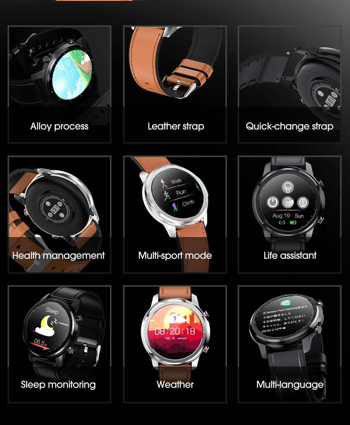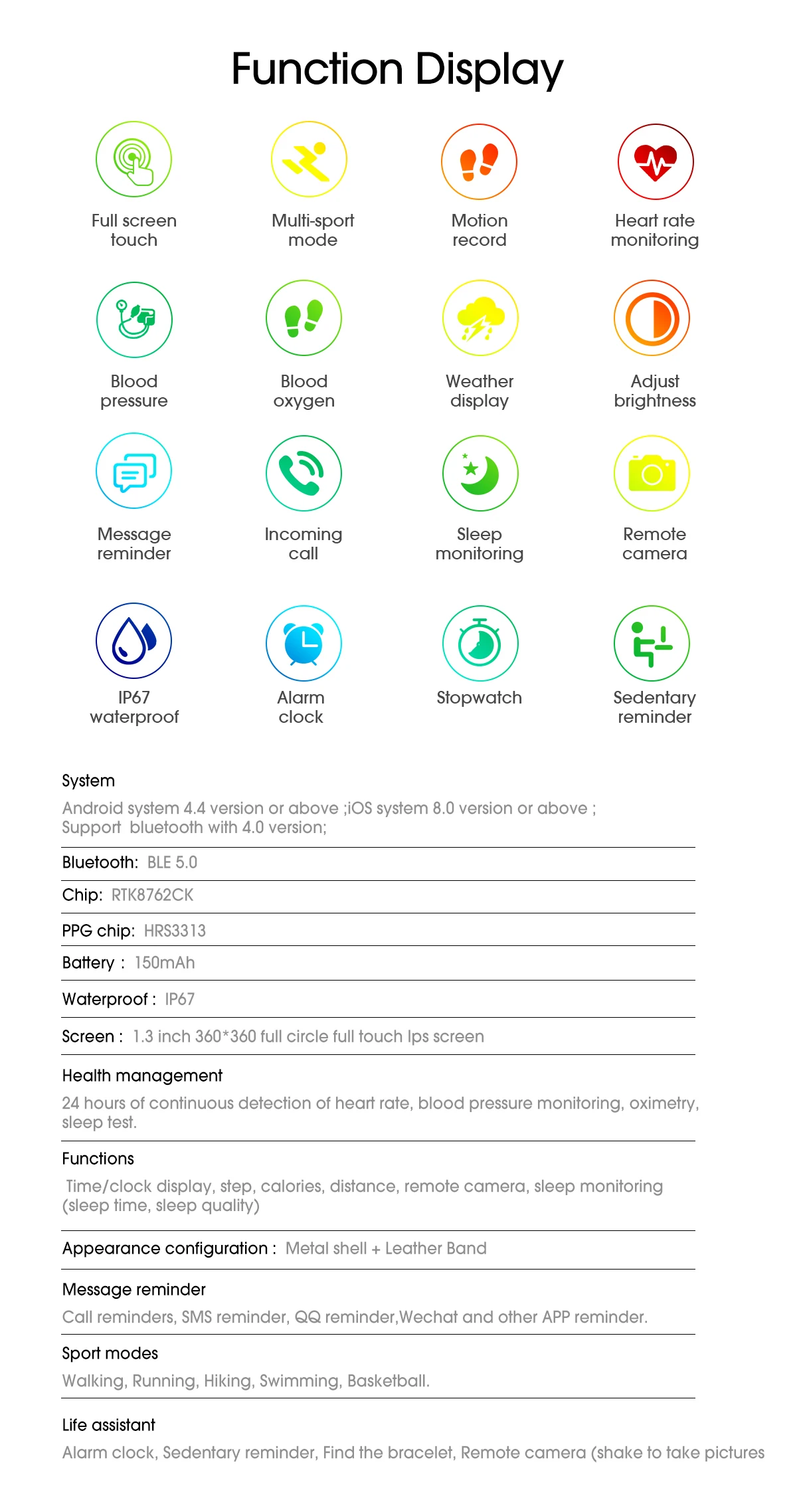 1,3 дюймовый цветной круг full HD IPS 24 часа непрерывного обнаружения пульса, мониторинга артериального давления, оксиметрии, даты сна Отображение времени/часов, шаг, калории, расстояние, сон, камера Металлический корпус + кожаный ремешок Мониторинг сна (время сна, качество сна) Напоминания о звонках, SMS-напоминания, qq-напоминания, напоминания о Wechat и других приложениях. Спортивный режим: ходьба, бег, туризм, плавание, баскетбол Будильник, напоминание о сидячем положении, найти браслет Камера с дистанционным управлением (встряхните, чтобы сделать снимок) Язык приложения: китайский, традиционный китайский, английский, японский, корейский, немецкий, русский, испанский, итальянский, французский, португальский, арабский, чешский, греческий, персидский, голландский, польский, финский, шведский язык, тайский Синхронизация приложений Android и Apple: FitCloudPro Система Android версии 4,4 или выше; Система iOS версии 8,0 или выше; Поддержка bluetooth с версией 4,0; Версия Bluetooth: BLE 5,0 Чип: RTK8762CK Микросхема PPG: HRS3313 Аккумулятор: 150 мАч Уровень водонепроницаемости: IP67