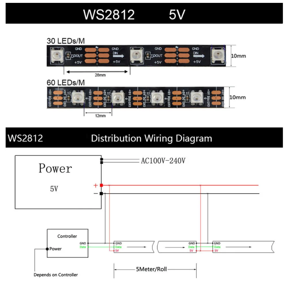 WS2812B должен использовать блок питания DC5V и светодиодный контроллер управления для управления!