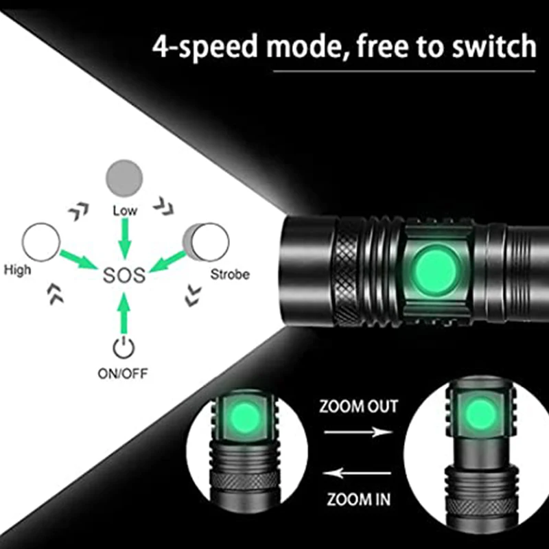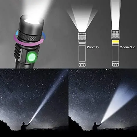 Освободите руки-Компактный дизайн удобно лежит в кармане, рюкзак, 5 унций по весу, 5,5 дюймов в длину. Использование без использования рук С Двойным Зажимом направления, идеально подходит для любой работы без рукУниверсальные режимы масштабирования-Он имеет 4 полезные настройки: высокий, низкий, стробоскоп, SOS. Широкое и узкое увеличение луча делает его идеальным для использования вокруг дома, biycycle, охоты, работы или ремонтаВодонепроницаемый и прочный-Корпус этого тактического фонарика изготовлен из высококачественного алюминиевого сплава, предназначенного для практически неразрушаемого и водонепроницаемого IPX5 защищает его от брызг воды со всех сторонПерезаряжаемый фонарик-Питание от перезаряжаемого литий-ионного аккумулятора емкостью 2200 мА · Ч. Встроенный usb-порт для зарядки и кабель и дополнительная батарея не потребуется. Это напомнит вам заряжать, когда напряжение батареи низкое