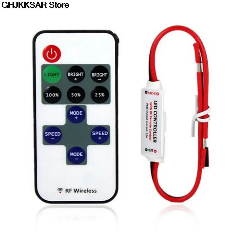 ПараметрыДинамический режим: 8 режимовДинамический уровень скорости: 10 уровнейУровень яркости освещения: 10 уровнейКласс ШИМ: 256 классовЭффект плавного диммера: ДаРабочее напряжение: 5 ~ 24 В постоянного токаВыходной ток: пик 12АРежим дистанционного управления: Беспроводной RFЧастота дистанционного управления: 433,92 МГцУдаленное Расстояние: >15 м на открытой местностиПримечание:Аккумулятор в комплект не входитПосылка включает в себя:1 х мини Встроенный светодиодный светильник контроллер/диммер1 беспроводной пульт дистанционного управления R106