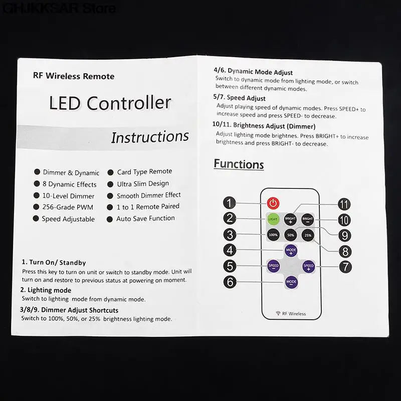 Функции для радиочастотного беспроводного пульта дистанционного управленияДиммер и динамический8 динамических эффектов10 уровней диммер256 класс ШИМРегулируемая скоростьПульт дистанционного управления типа картыУльтратонкий дизайнЭффект плавного диммераОт 1 до 1 пульт дистанционного управления в пареФункция автоматического сохраненияУстановка для радиочастотного беспроводного пульта дистанционного управления1. Источник питанияЭтот блок принимает DC 5V до 24V источник питания. Красный кабель должен быть подключен к положительному и Черному кабелю к отрицательному.Пожалуйста, выберите правильный источник питания в соответствии с светодиодный-приложением.2. Светодиодный выходКрасный кабель должен быть подключен к положительному и черно-светодиодный кабелю к отрицательному. Пиковый выходной ток 12А, пожалуйста, уменьшите нагрузку, если основной блок перегревается.Внимание: Не замыкайте светодиодный выход, это может привести к постоянным повреждениям!3. Пульт дистанционного управленияПожалуйста, вытяните изоляционную часть перед использованием. Радиочастотный беспроводной дистанционный сигнал может проходить через барьер, поэтому нет необходимости стремиться к основному устройству при эксплуатации. Для правильного приема удаленного сигнала не устанавливайте основной блок в закрытых металлических частях. Удаленный аккумулятор 3 в CR2025 типа, пожалуйста, замените только на тот же тип батареи.