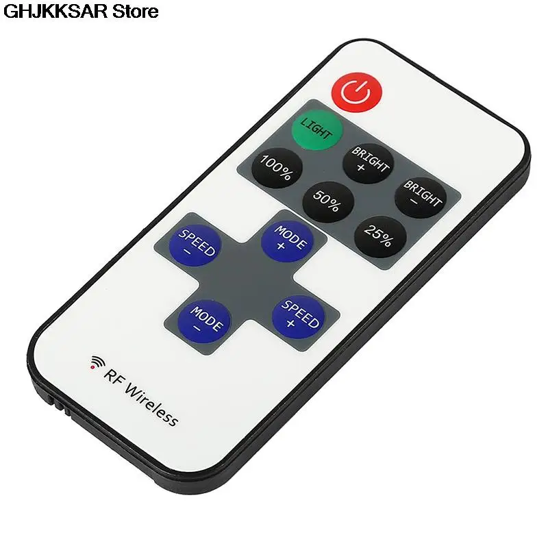 Инструкции для радиочастотного беспроводного пульта ДУ1. Включение/режим ожиданияНажмите эту клавишу, чтобы включить устройство или переключиться в режим ожидания. Устройство включится и восстановит предыдущий статус при включении.2. Режим освещенияПереключение в режим освещения из динамического режима.3/8/9. Диммер настраивает ярлыкиПереключение на 100%, 50% или 25% режим яркости освещения.4/6. Настройка динамического режимаПереключение в динамический режим из режима освещения или переключение между различными динамическими режимами.5/7. Регулировка скоростиРегулировка скорости воспроизведения динамических режимов. Нажмите скорость + для увеличения семян и нажмите скорость-для уменьшения.10/11. Регулировка яркости (диммер)Регулировка яркости режима освещения. Нажмите BRIGHT + для увеличения яркости и нажмите BRIGHT-для уменьшения