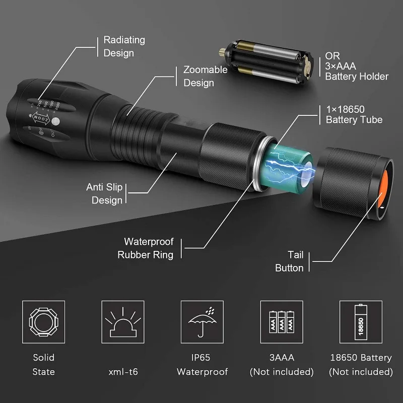 -Материал корпуса: алюминиевый сплав.-Источник: светодиодный светильник T6, L2, V6.-Расположение режима: Высокий> Средний> Низкий> Быстрый стробоскоп> SOS.-Отражатель: алюминиевый отражатель.-Расположение переключателя: на задней крышке.-Тип переключателя: кнопочный переключатель.-Светодиодный чип на плате) Срок службы: около 50000 часов.-Батарея: 1*18650 батарея (не входит в комплект) или 3 * AAA батареи (не входят в комплект).-Внутренняя цепь принимает эффективные выходные схемы постоянного тока.-Поддержка ручной фокусировки, для удобства в эксплуатации.-Водонепроницаемый дизайн, компактный размер и удобно носить с собой.-Особенно подходит для таких видов активного отдыха, как кемпинг, туризм и т. д..