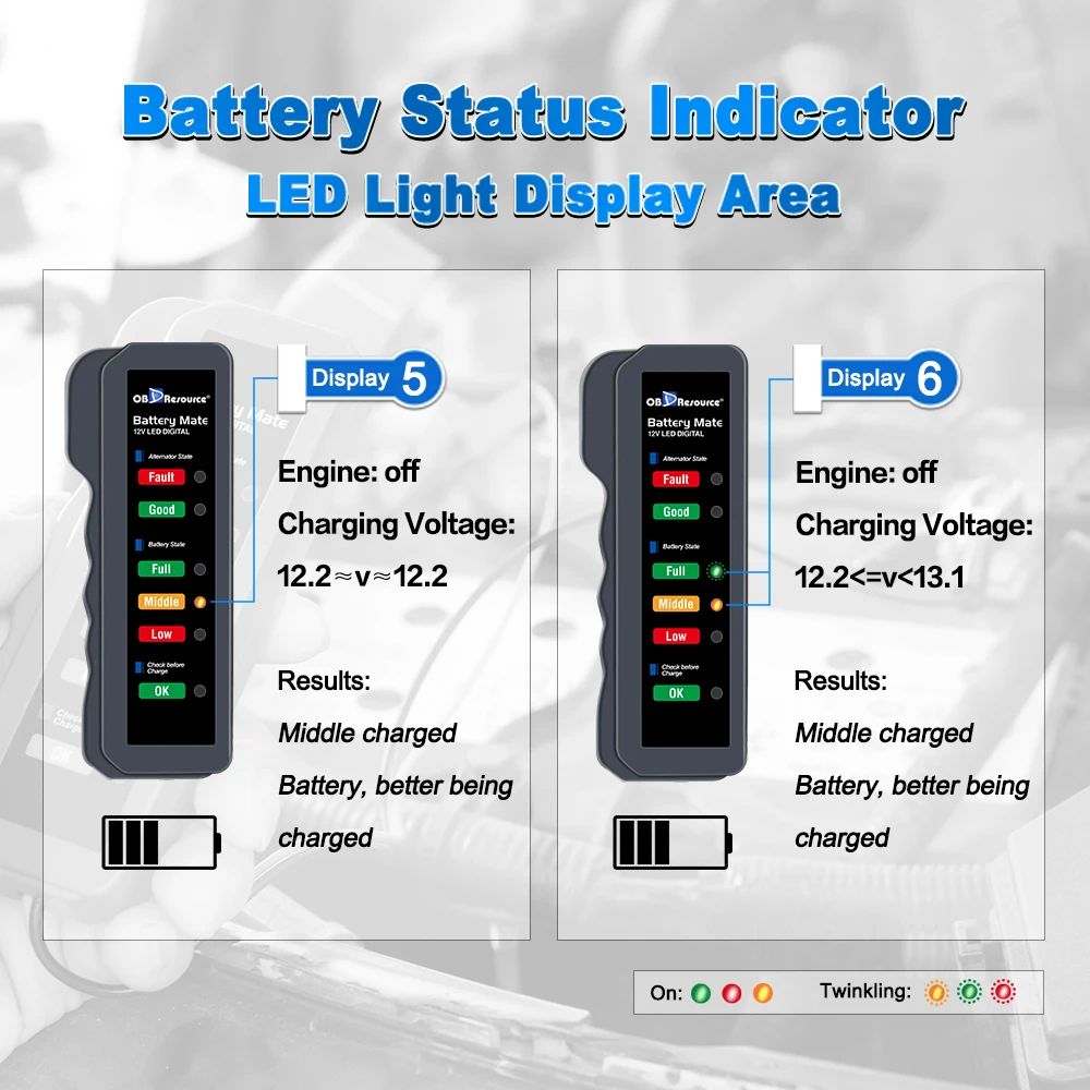 Дисплей 3: горит светодиод «OK», мигает светодиод «Low»; Результаты тестирования: напряжение зарядки 11,1-11,5 в, низкий заряд аккумулятора, незамедлительная зарядка.Дисплей 4: «низкий» светодиод включен, «Средний» светодиод мерцает; Результаты тестирования: напряжение зарядки 11,6-12 В, средний зарядАккумулятор лучше заряжать быстрее.